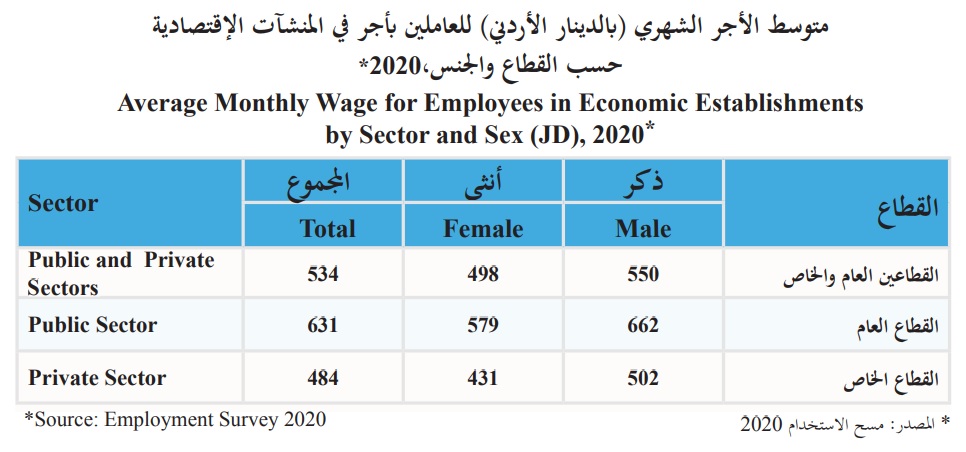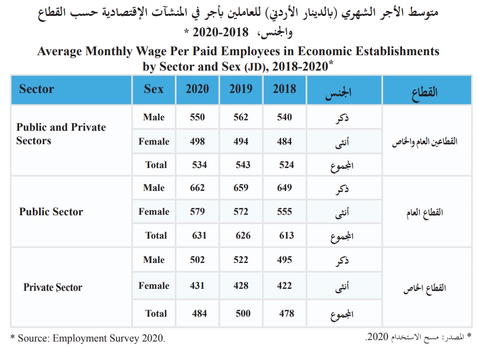 وبلغ متوسط الدخل الشهري للذكور العاملين في القطاع العام 662 دينارا شهريا و502 دينارا في القطاع الخاص، مقابل 579 دينارا للايناث العاملات في القطاع العام و431 دينارا للعاملات في القطاع الخاص.
