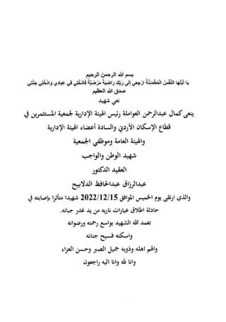 نعى رئيس جمعية المستثمرين في قطاع الاسكان الأردني كمال العواملة، وأعضاء الهيئة الإدارية والكوادر العاملة، شهيد الوطن والواجب وابنه البار، العقيد عبدالرزاق عبد الحافظ الدلابيح نائب مدير شرطة معان الذي ارتقى شهيدا برصاص الغدر الآثم الخميس الماضي.