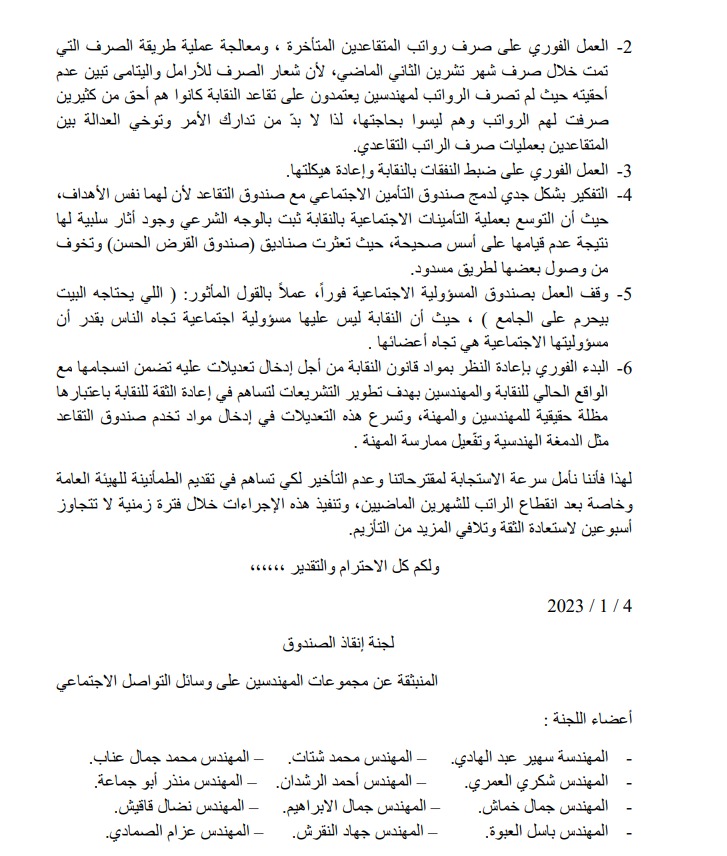 واعتبر مجموعة من المهندسين أن أزمة صندوق النقابة وعدم صرف الرواتب التقاعدية هي قضية أمن مجتمعي بإمتياز، وللمساهمة في نزع فتيل الأزمة اقترحوا مسارين لحلحلة الامور تتمثل: