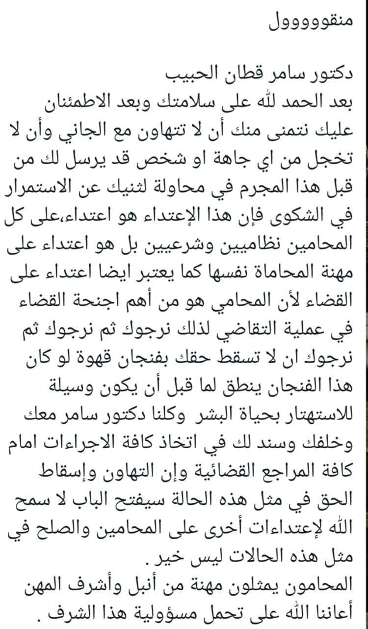 القضية وبحسب القطان تم إحالتها للمدعي العام إلا أن الجاني تغيب عن جلسات المحكمة، وقبل موعد الجلسة التي كانت الخميس الماضي، أي يوم الثلاثاء من ذات الأسبوع، ترصد الجاني للقطان أمام وزراة الصناعة والتجارة التي كانت مسرحا لجريمة الاعتداء.