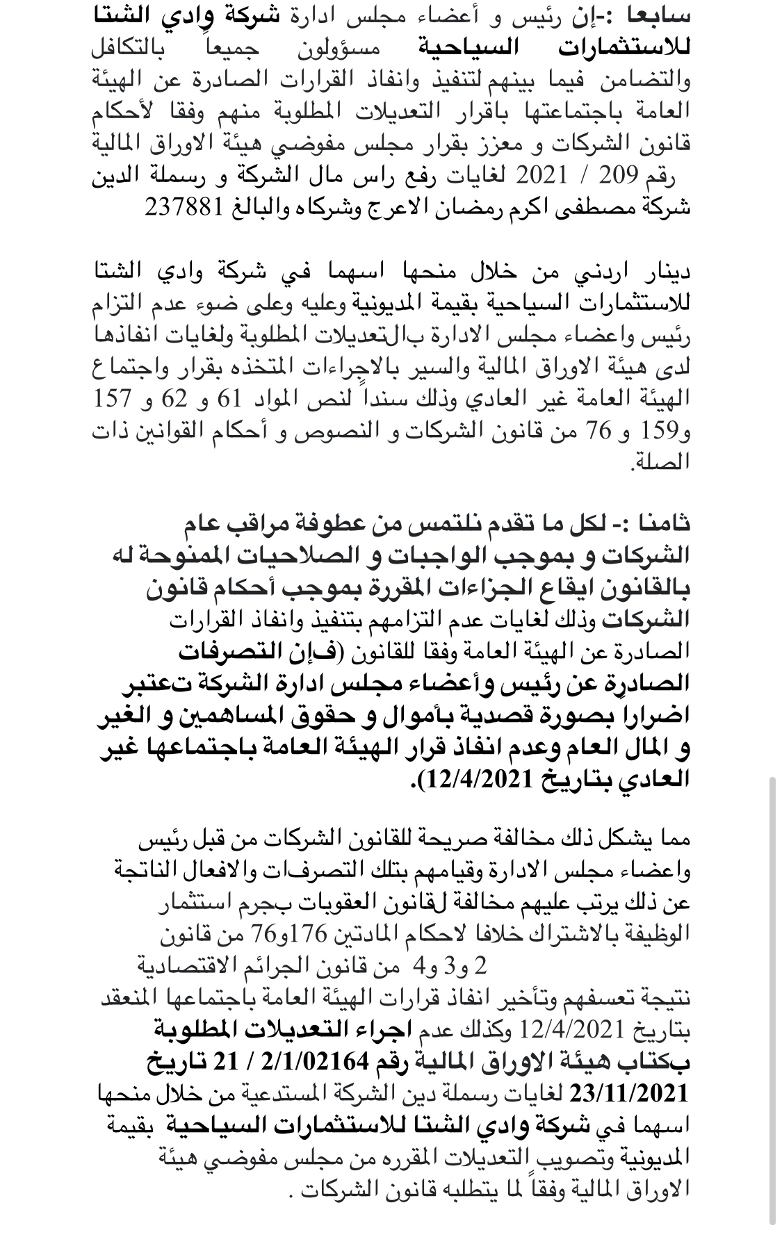 وجهت شركة مصطفى أكرم رمضان وشركاه شكوى خطية ضد رئيس وأعضاء مجلس إدارة شركة وادي الشتا للاستثمارات السياحية المساهمة العامة مالكة فندق رمادا في البحر الميت بسبب عدم تنفيذ قرارات الهيئة العامة المتخذة بإجتماع غير عادي بتاريخ 20/4/2021 والمخصص لرفع رأس مال الشركة ورسملة الدين لصالح شركة أكرم رمضان الأعرج والبالغ 237 ألف دينار من خلال منحها أسهماً بقيمة المديونية في شركة وادي الشتا وبسبب عدم تنفيذ التعديلات المطلوبة الواردة للشركة لكتاب هيئة الاوراق المالية والذي يحمل مضمون رسملة الدين بالاسهم بقيمة المديونية وتصويب التأمينات المقررة من مجلس مفوضي هيئة الأوراق المالية بالاضافة الى مخالفة رئيس وأعضاء مجلس الادارة لقوانين الشركات والعقوبات والجرائم الاقتصادية لنفس السبب.