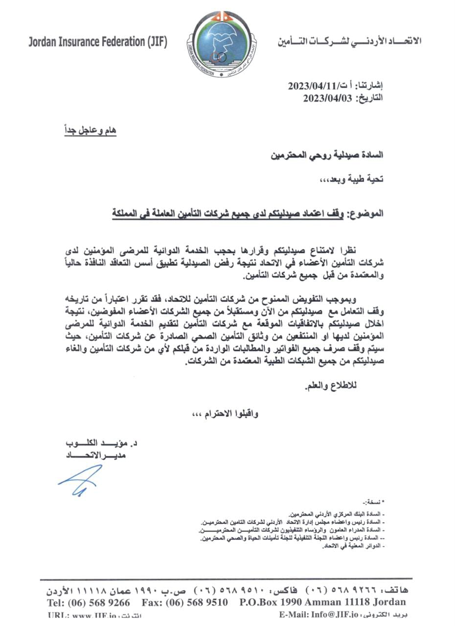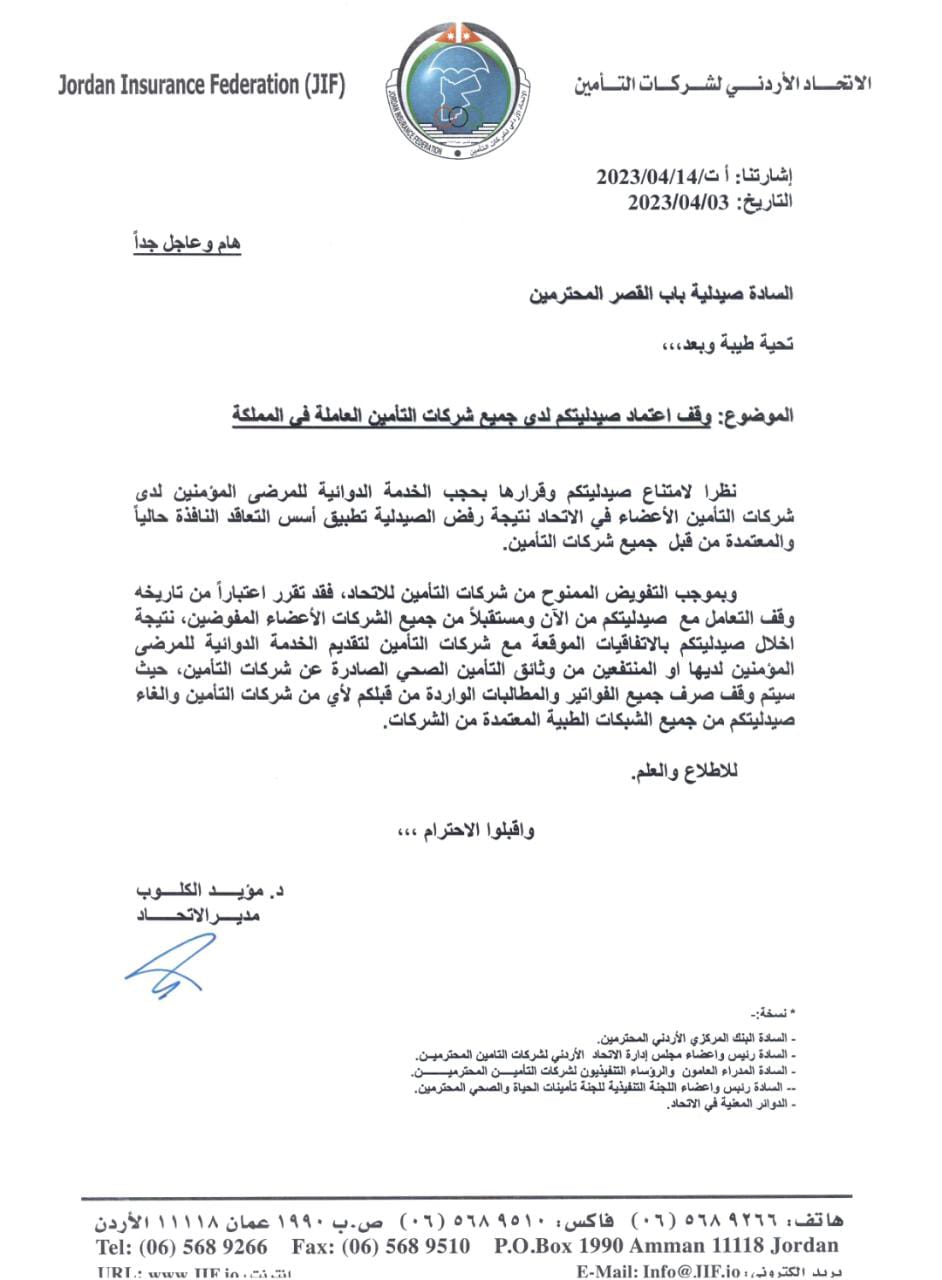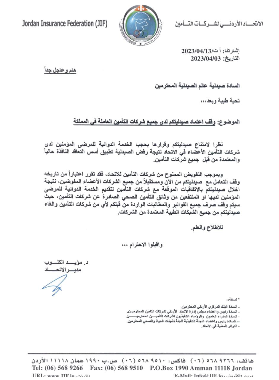 الاتحاد الأردني لشركات التأمين النقابة والصيدليات التي ترفض خدمة المرضى