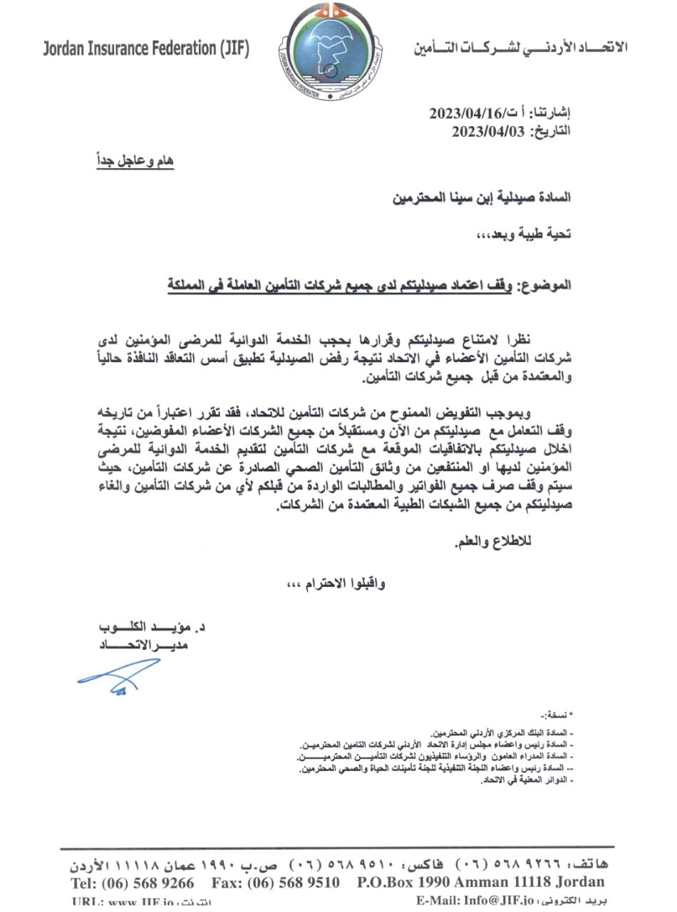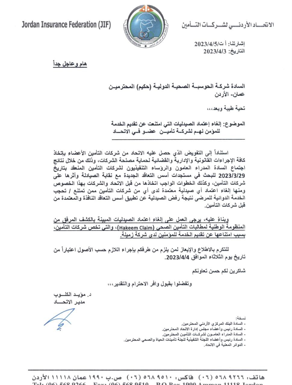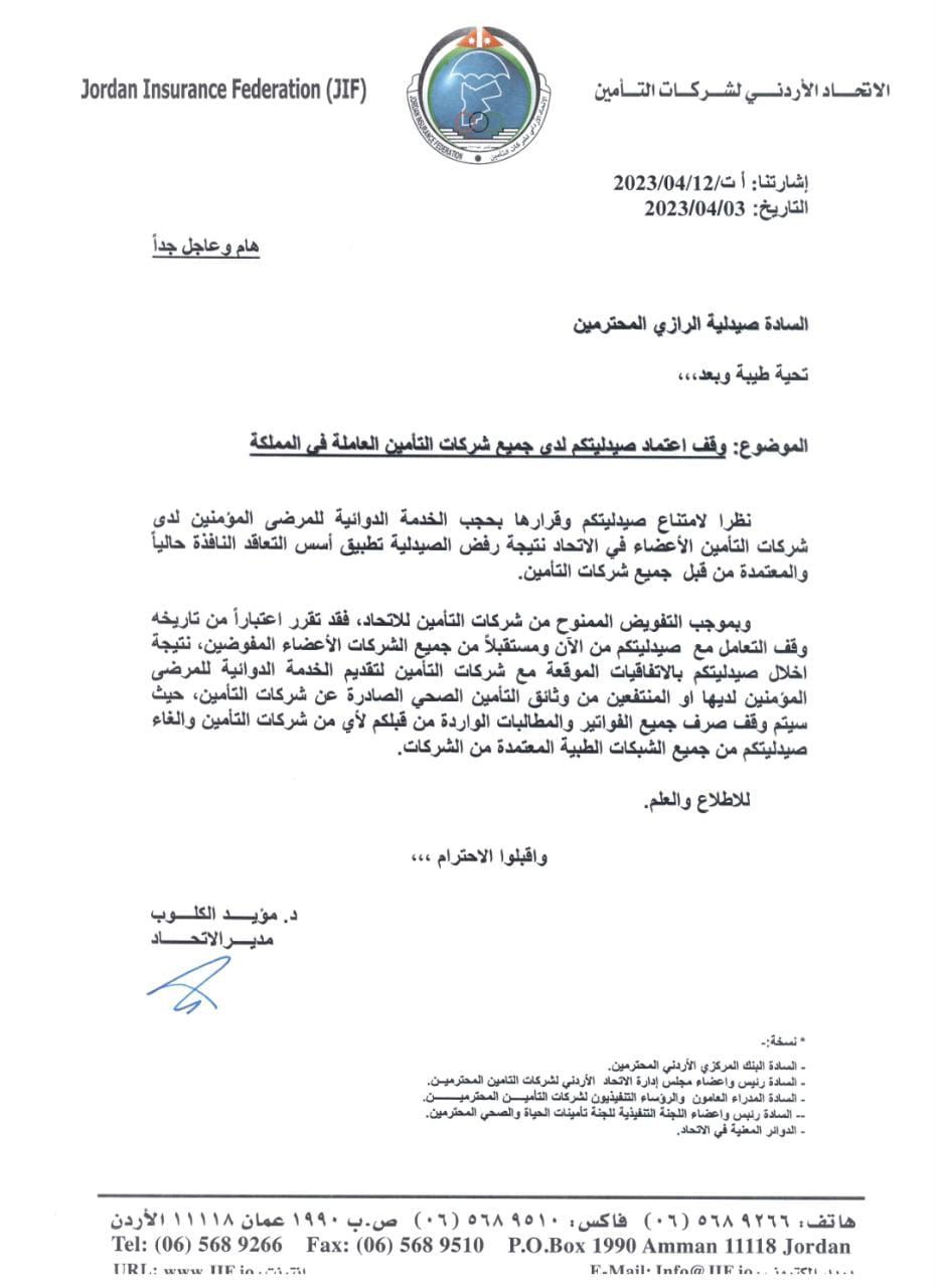 الاتحاد الأردني لشركات التأمين النقابة والصيدليات التي ترفض خدمة المرضى