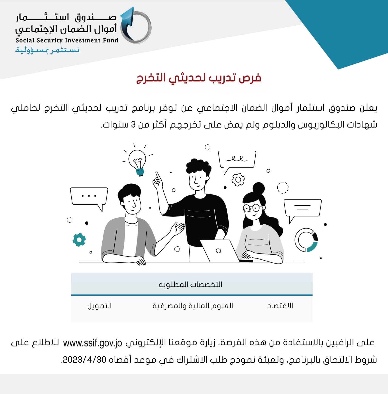 أخبار البلد ــ أعلن صندوق استثمار أموال الضمان الاجتماعي عن توفيره برامج تدريب لحديثي التخرج من حملة شهادات البكالوريوس والدبلوم، ولم يمضِ على تخرجهم 3 سنوات.
