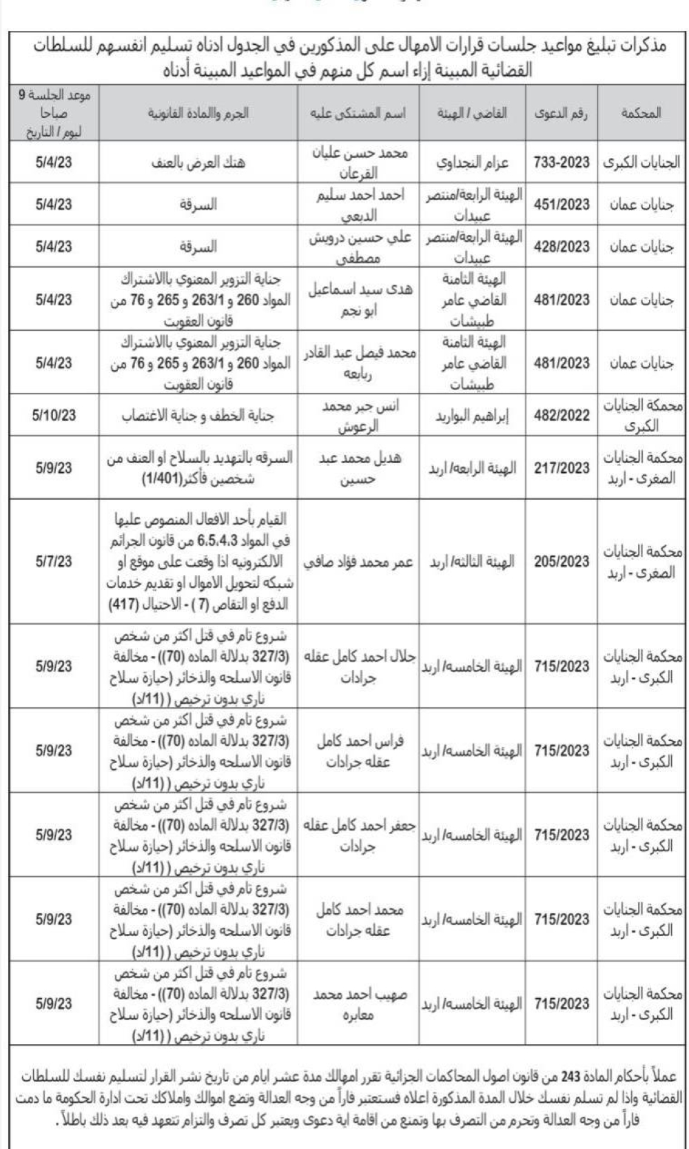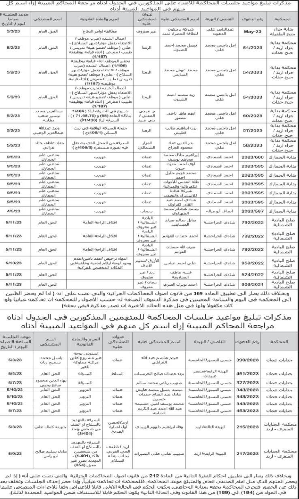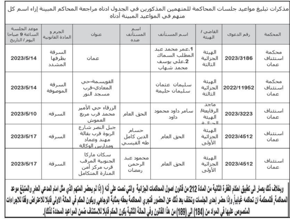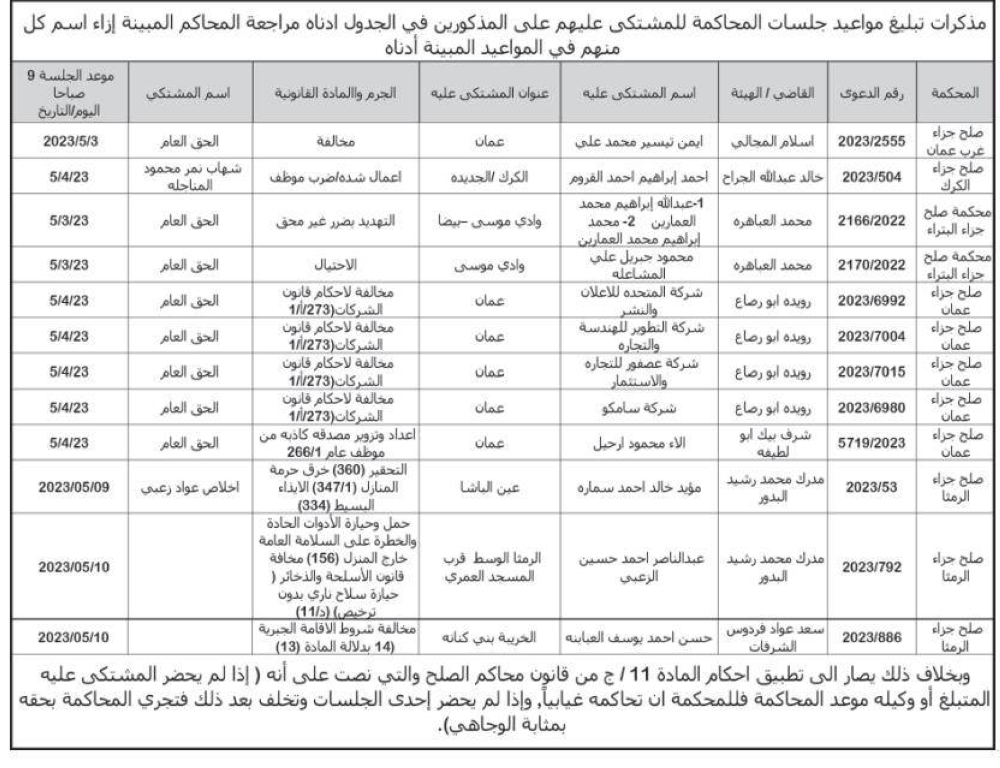 أخبار البلد- صدرت اليوم الاثنين مذكرات تبليغ مواعيد جلسات المحاكمة لمشتكى عليهم وطلبت المذكرات من المذكورين في الجداول أدناه مراجعة المحاكم المبينة ازاء اسم كل منهم في المواعيد المبينة أدناه.