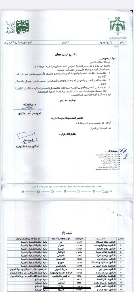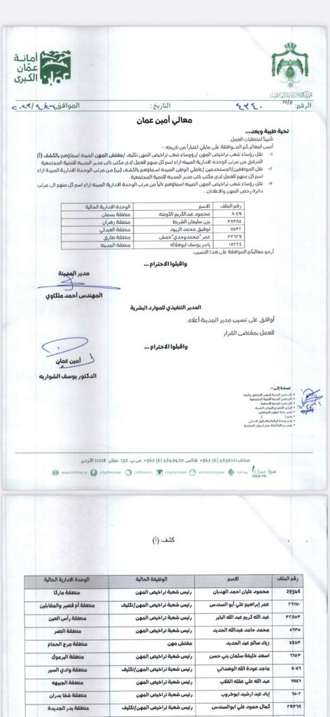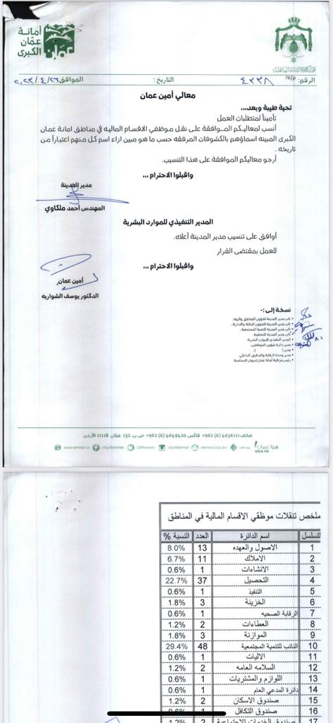 وكانت رسالة تناقلت بين موظفي أمانة عمان وصلت نسختها لـ أخبار البلد، قد حدت سبب نقل الموظفين لأقسام لا تتناسب مع خبراتهم المكسبة على مدى 25 عامًا، بأجندات داخلية لمجموعة مدارء يسعون لتحقيق أجندات شخصية ستؤثر على طبيعة الخدمات المقدمة للمواطن.