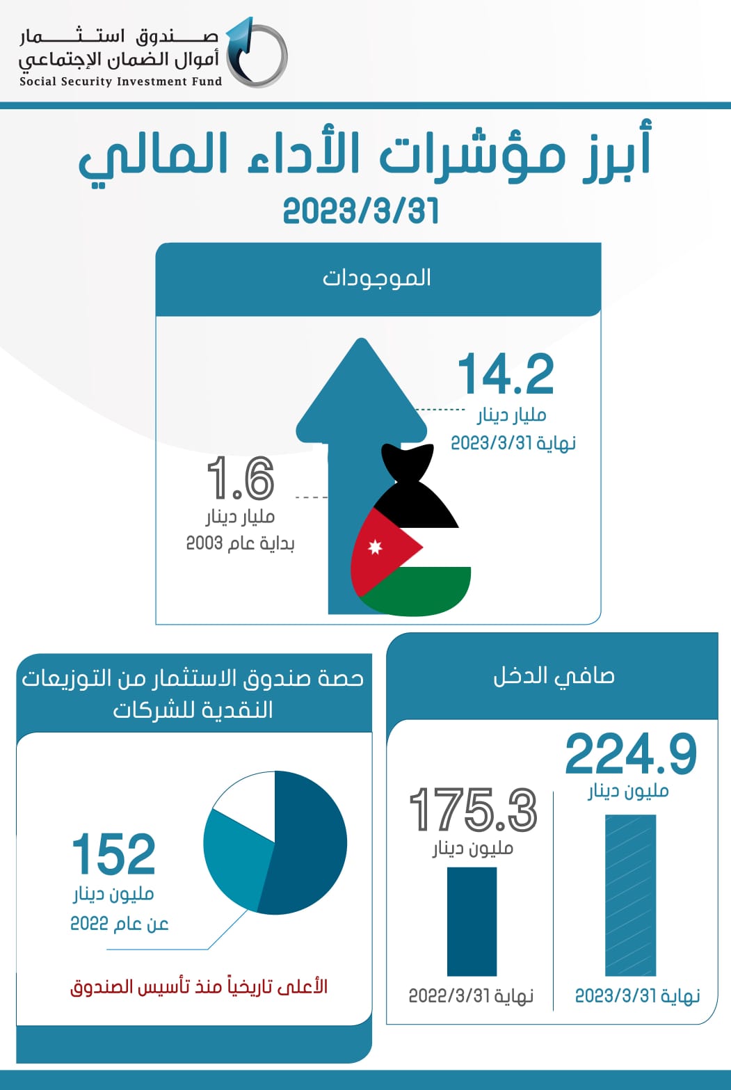 أخبار البلد ــ ارتفعت موجودات صندوق استثمار اموال الضمان الاجتماعي لتصل الى حوالي 14.2 مليار دينار نهاية الربع الأول من عام 2023، مقارنة مع 13.8 مليار دينار نهاية عام 2022.