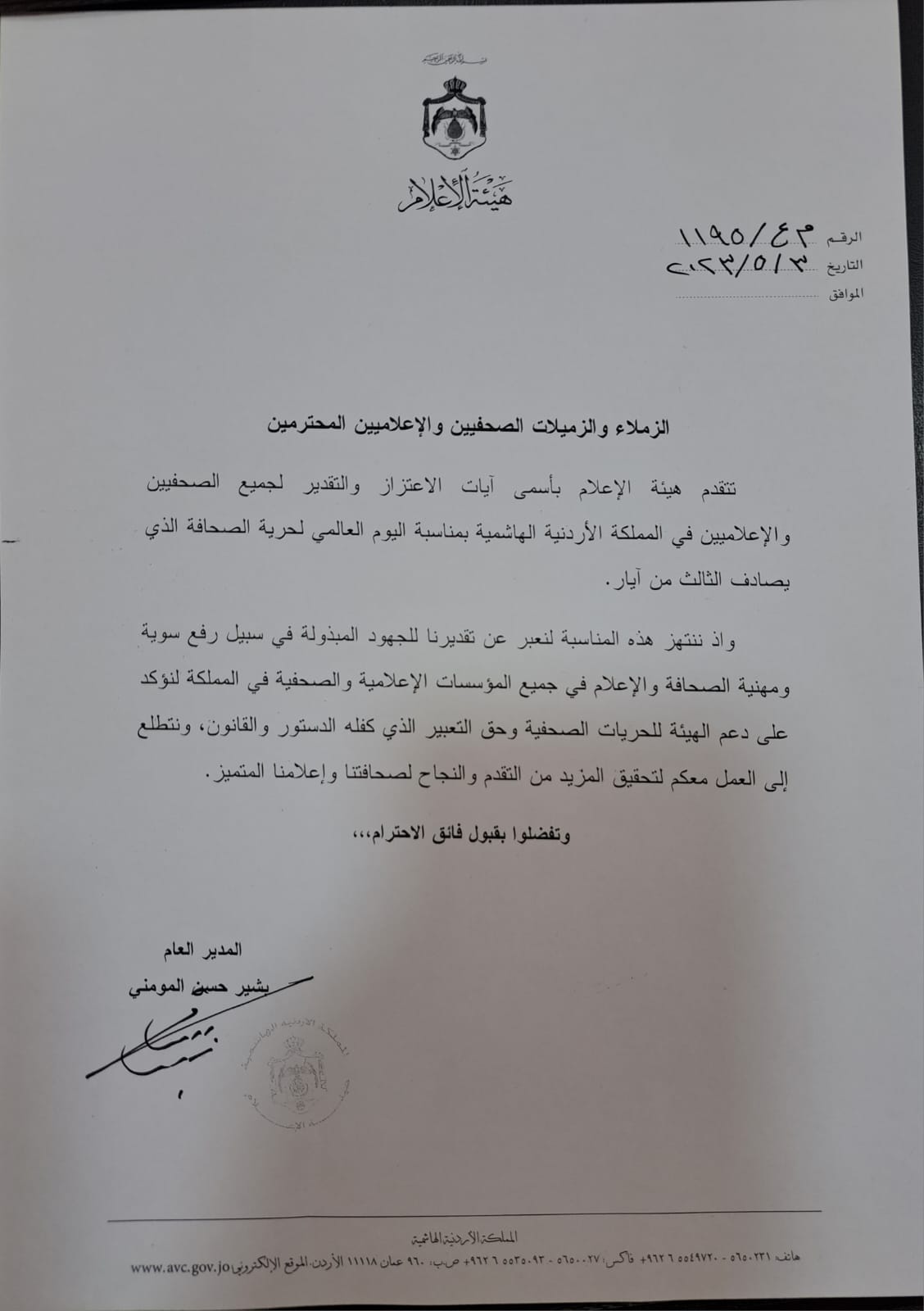 تتقدم هيئة الإعلام بأسمى أيات الاعتزاز والتقدير لجميع الصحفيين والإعلاميين في المملكة الأردنية الهاشمية بمناسبة اليوم العالمي لحرية الصحافة الذي يصادف الثالث من أيار.