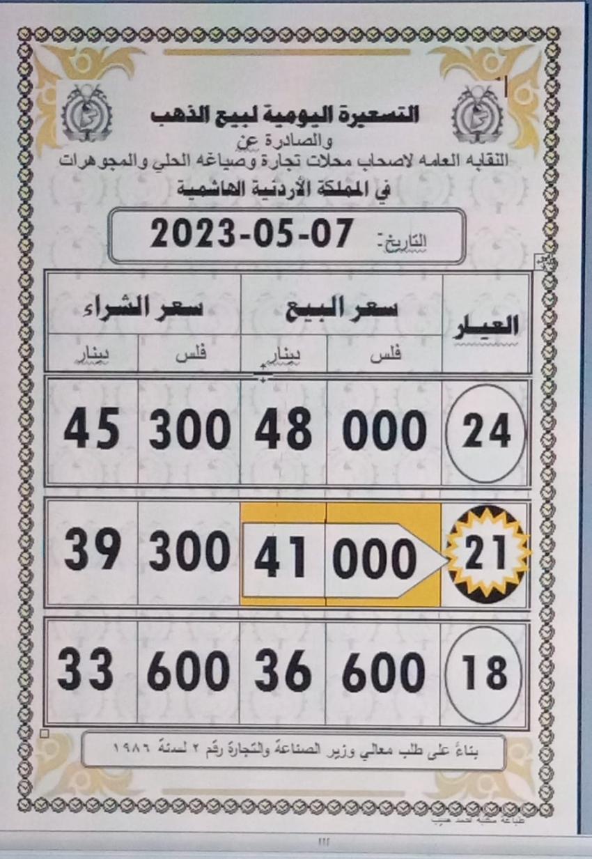 وبلغ سعر الذهب عيار 21 الأكثر طلبا من قبل الأردنيين، 41.00 دينارا لجهة الشراء من المحلات و 39.30 دينارا لجهة البيع.