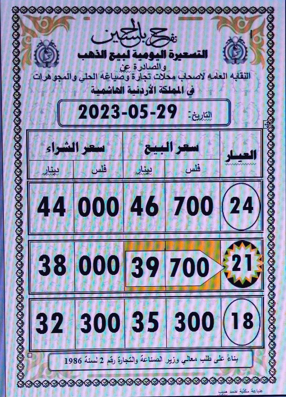 كما بلغ سعر بيع الغرام الواحد من الذهب عياري 24 و18 لغايات الشراء من محلات الصاغة، 46.7 و35.3 دينارا على التوالي.