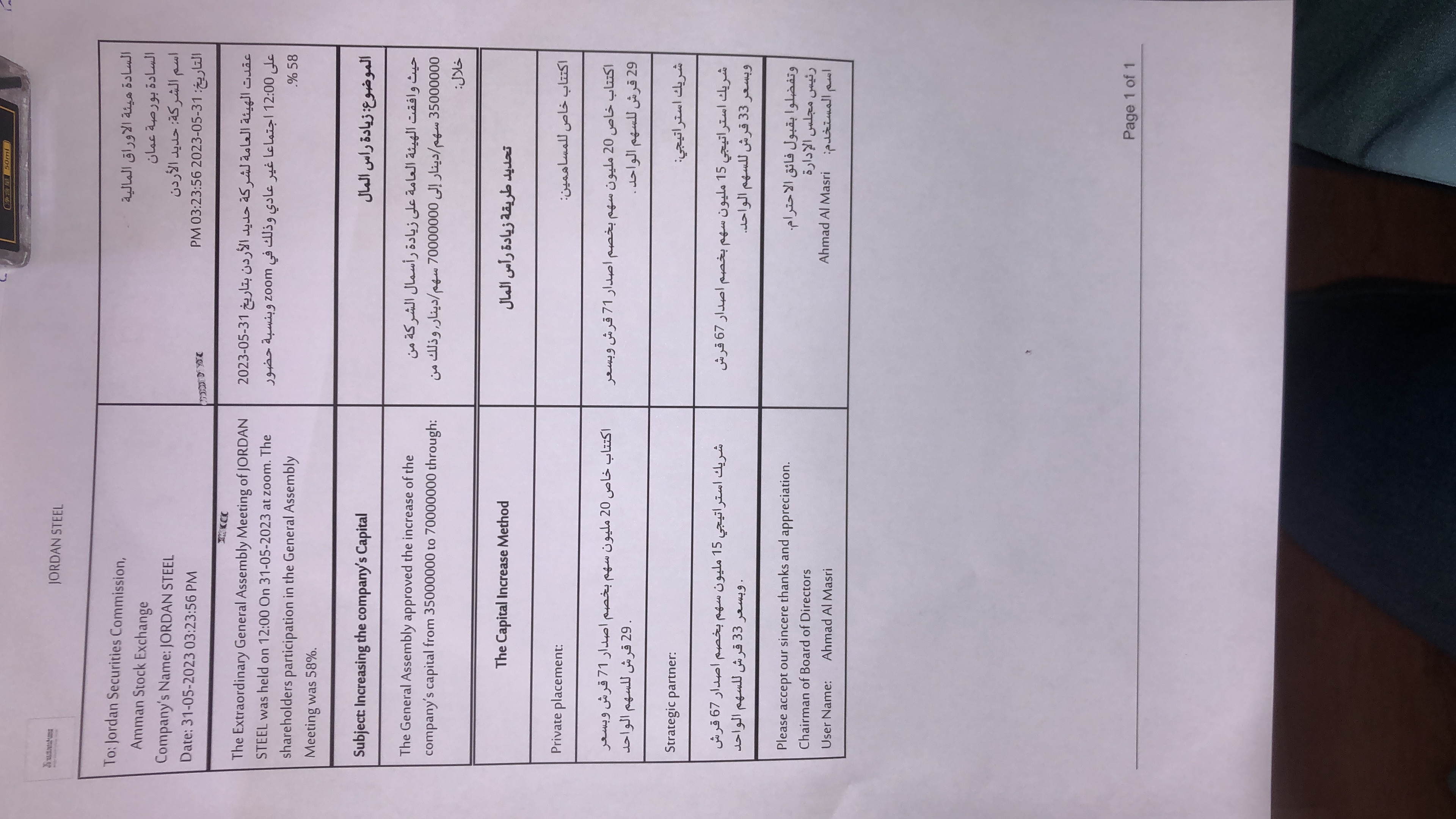 وجرى خلال الإجتماع مناقشة زيادة رأس المال الشركة وحظيت على موافقة الهيئة العامة على زيادة 35 مليون سهم/ دينار إلى 70 مليون سهم/ دينار وذلك من خلال إكتتاب خاص 20 مليون سهم بخصم اصدار 71 قرش وبسعر 29 قرش للسهم الواحد ومن خلال تحديد شريك استراتيجي 15 مليون سهم بخصم اصدار 67 قرش وبسعر 33 قرش للسهم الواحد.