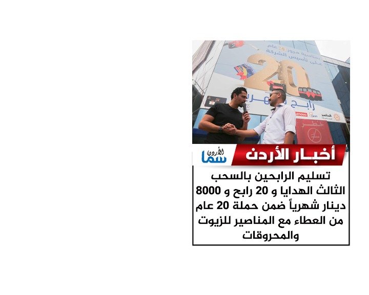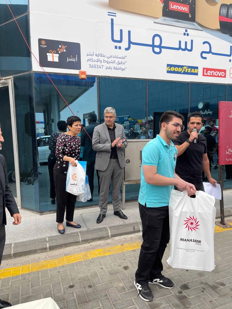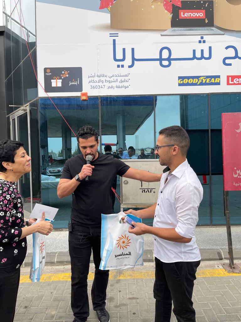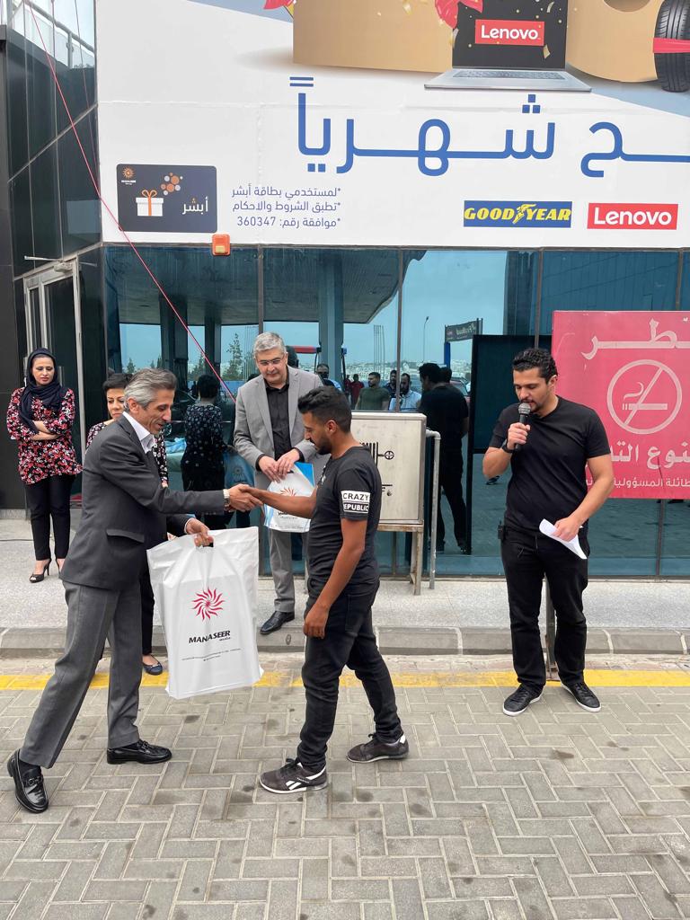 تسليم مجموعة من الرابحين بالسحب الثالث ضمن احتفالات المناصير للزيوت والمحروقات بمناسبة مرور 20 عام على تأسيسها .. 20 رابح و 8000 دينار شهرياً ضمن حملة 20 عام من العطاء وذلك خلال البث المباشر على مواقع التواصل الاجتماعي لشركة المناصير للزيوت والمحروقات ع الهوا مع راديو نشامى بتقديم الاعلامي هيثم الوكيل وبرنامج دق سلف برعاية المناصير للزيوت والمحروقات وحضور ممثلين من الشركات عدد من الرابحين والجمهور .