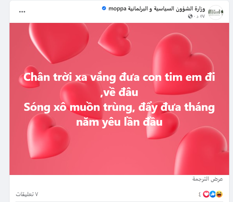 ونشرت صفحة الوزارة منشوراً باللغة الفيتنامية، ولدى ترجمته تبين أنه يعني "حيث يأخذ الأفق البعيد قلبي ،الأمواج تندفع وتتزامن، دافعة الحب الأول في مايو".