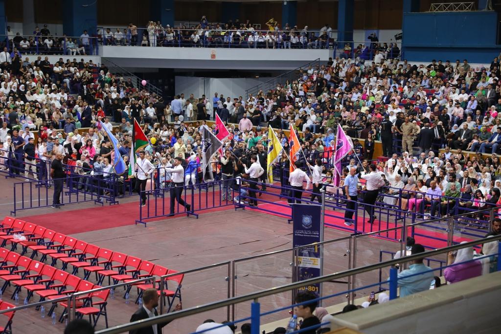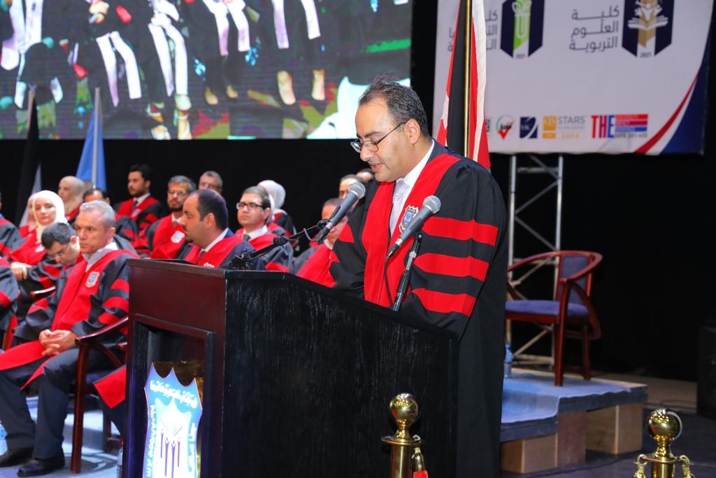 ·وقد استهل الحفل بتلاوة عطرة من القران الكريم ، بعد السلام الملكي، ثم ألقى عميد شؤون الطلبة الدكتور مصطفى عطيات كلمة في الحفل حيّا فيها عطوفة الدكتور ماهر الحوراني رئيس هيئة المديرين ونائب رئيس مجلس الأمناء وعطوفة راعي الحفل الأستاذ الدكتور ساري حمدان رئيس الجامعة والسادة أصحاب المعالي والعطوفة والسعادة أعضاء مجلس أمناء الجامعة والسادة العمداء وأعضاء الهيئتين التدريسية والادارية ، و رحب بالضيوف والحضور ، والخريجين قائلا :