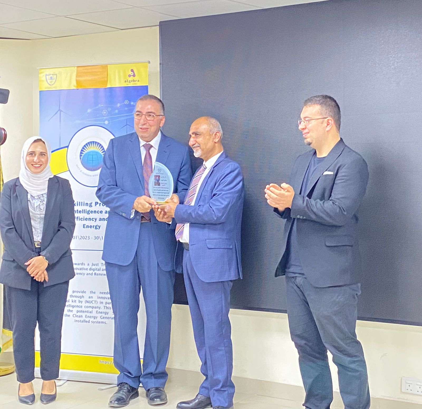 وفي ختام الحفل قام السيد ابراهيم الساكت والدكتور عميد الكلية والسيد احمد الطوافشة مدير عام شركة الجبرا بتوزيع الشهادات على خريجي دورة برنامج تطوير المهارات والمسوم بــ "تطبيقات الذكاء الصناعي في كفاءة الطاقة والطاقة المتجدده" التي نظمتها الكلية في حرمها بالتعاون مع الشريك الاستراتيجي شركة الجبرا وبدعم وتمويل من منظمة العمل الدولية .