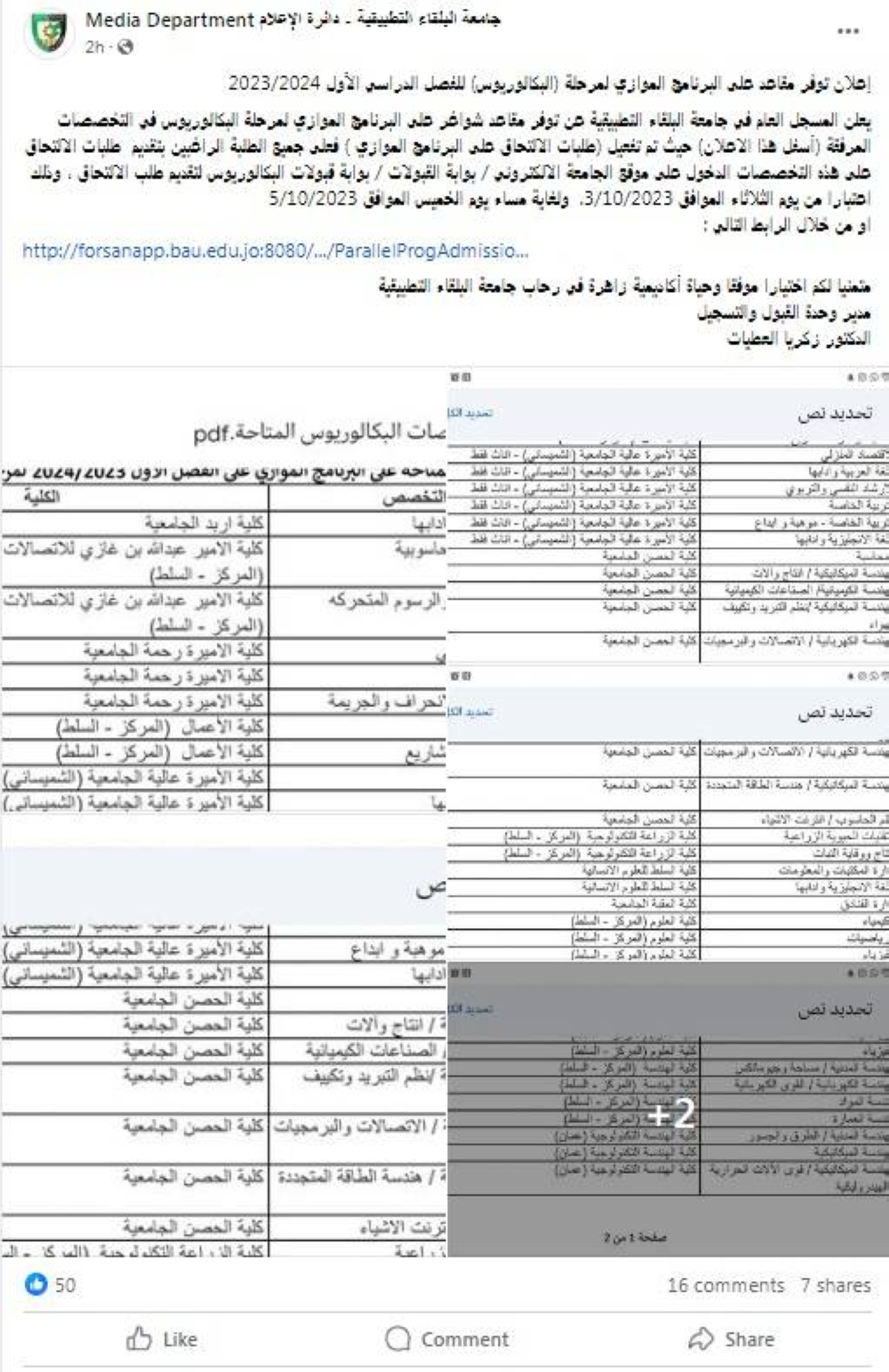 وأكد في منشور عبر فيسبوك أنه تم تفعيل طلبات الالتحاق على البرنامج الموازي فعلى جميع الطلبة الراغبين بتقديم طلبات الالتحاق على هذه التخصصات الدخول على موقع الجامعة الالكتروني / بوابة القبولات / بوابة قبولات البكالوريوس لتقديم طلب الالتحاق، وذلك من يوم أمس الثلاثاء الموافق 3/10/2023 ولغاية مساء يوم الخميس الموافق 5/10/2023.