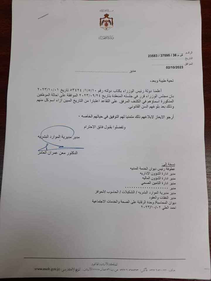 أخبار البلد - قرر مجلس الوزراء إحالة 12 موظفا في وزارة الصحة إلى التقاعد.