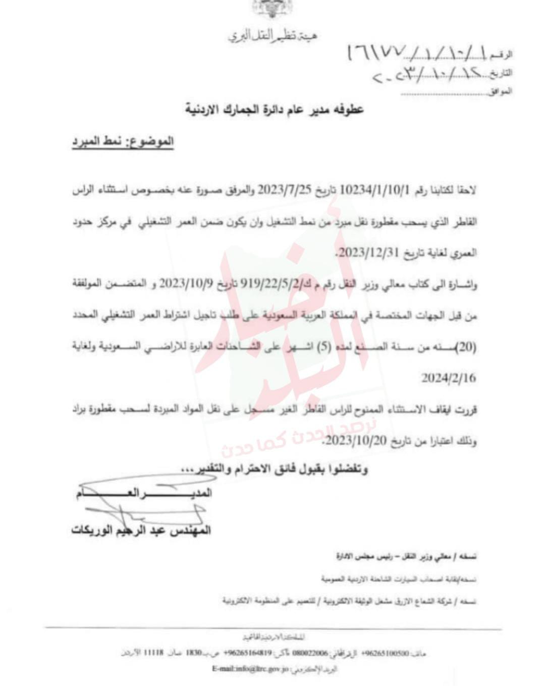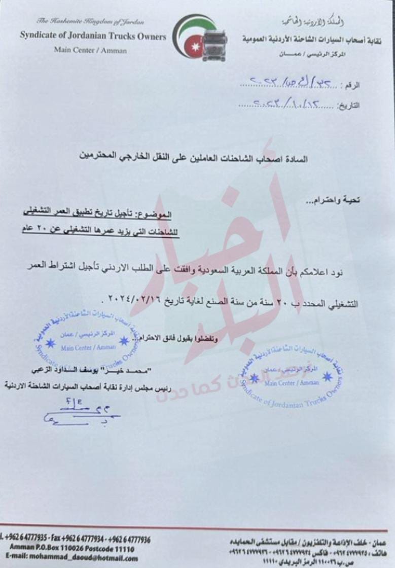 حصلت "أخبار البلد" على كتب رسمية صادرة عن هيئة تنظيم النقل البري تخبر بها دائرة الجمارك وأصحاب الشاحنات العاملين على النقل الخارجي بأن المملكة العربية السعودية وافقت على الطلب الأردني "تأجيل اشتراط العمر التشغيلي" المحدد بـ 20 سنة، من سنة الصنع لغاية 16/2/2024.