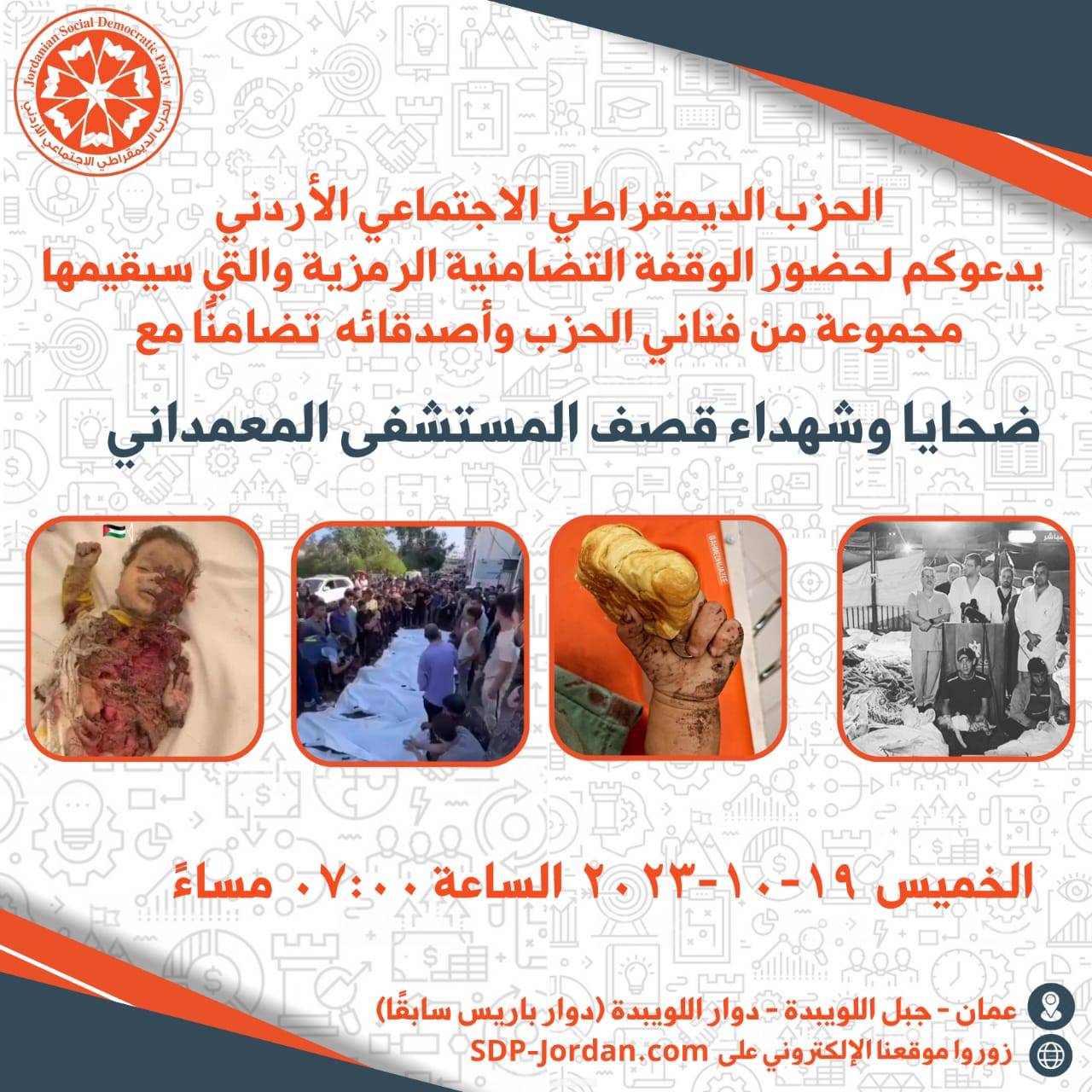 أعلن الحزب الديمقراطي الاجتماعي الأردني عن تنظيمه وقفة تضامنية اليوم في تمام الساعة السابعة مساءً، في عمان / جبل اللويبدة والتي سيقيمها مجموعة من فناني الحزب وأصدقائه تضامنا مع ضحايا وشهداء قصف المستشفى المعمداني.