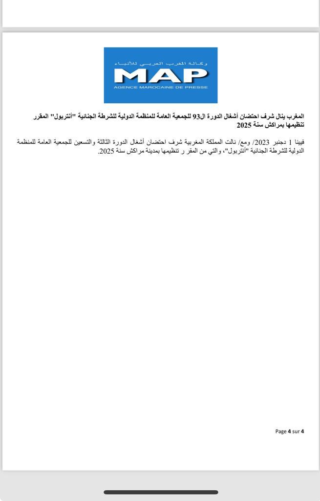 لمغرب ينال شرف احتضان أشغال الدورة الـ 93 للجمعية العامة للمنظمة الدولية للشرطة الجنائية "أنتربول" المقرر 2025 تنظيمها بمراكش سنة فيينا 1 دجنبر 2023 / ومع/ نالت المملكة المغربية شرف احتضان أشغال الدورة الثالثة والتسعين للجمعية العامة للمنظمة 2025.