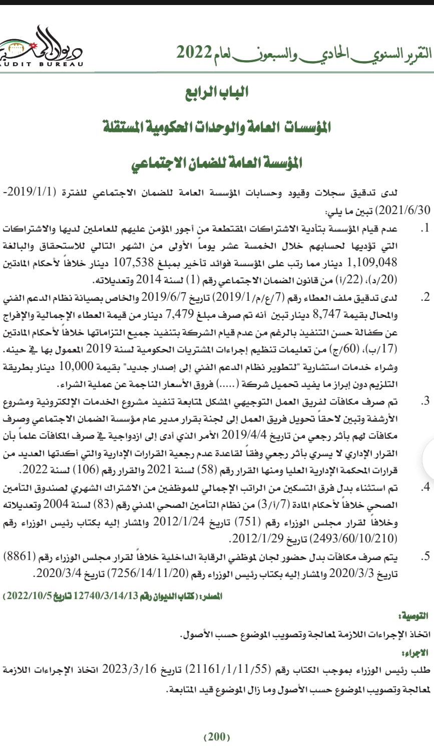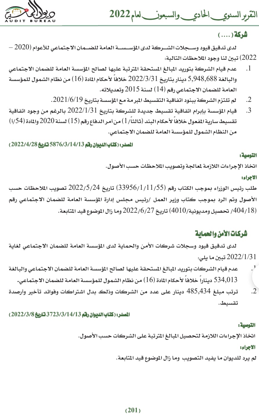 أظهر تقرير ديوان المحاسبة الـ ٧١ لعام ٢٠٢٢ بخصوص المؤسسة العامة للضمان الاجتماعي، وبعد الاتطلاع على الملفات والتدقيق في البيانات ومتابعة الملاحظات على مختلف الأصعدة، وجود جملة من الملاحظات والمخالفات تتعلق بعدم قيام المؤسسة بتأدية الاشتراكات المتقطعة من أجور المؤمن عليهم للعاملين لديها والاشتراكات التي تؤديها لحسابهم والبالغة مليون و100 ألف دينار مما رتب على المؤسسة فوائد تأخير تبلغ أكثر من 107 آلاف دينار، بالاضافة لصرف مبالغ مالية من القيمة الاجمالية لعطاء صيانة نظام الدعم الفني والافراج عن كفالة حسن التنفيذ بالرغم من عدم قيام الشركة بتنفيذ جميع التزاماتها، وشراء خدمات استشارية بقيمة 10 الاف دينار من احدى الشركات دون ابراز ما يفيد تحميلها فروق الأسعار الناجمة عن عملية الشراء، بالاضافة لصرف مكافآت متكررة بأثر رجعي لفريق العمل التوجيهي بشكل مخالف لقرارات المحكمة الادارية، واستثناء بدل فرق التسكين من الراتب الاجمالي للموظفين من الاشتراك الشهري لصندوق التأمين الصحي، وصرف مكافأت بدل حضور لجان لموظفي الرقابة الداخلية خلافاً لقرار مجلس الوزراء.
