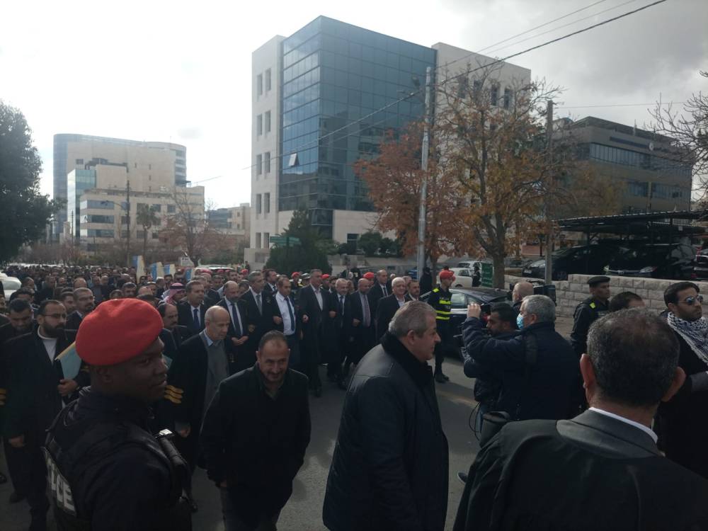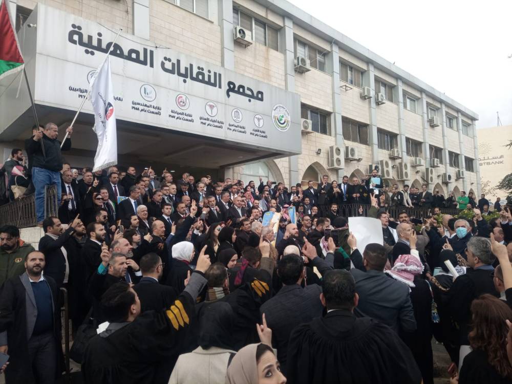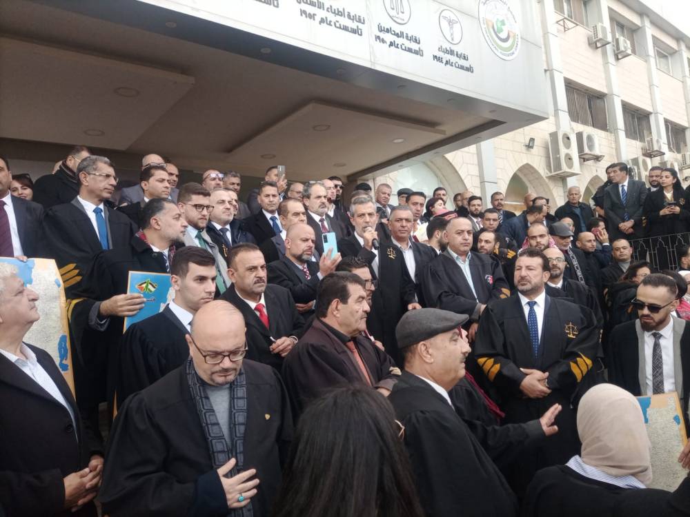 نفذت نقابة المحامين مسيرة من أمام قصر العدل في عمان باتجاه مجمع النقابات المهنية تنفيذا لقرار النقابة وبالتزامن مع مسيرات ووقفات نفذتها نقابات المحامين العربية بالتنسيق مع اتحاد المحامين العرب.