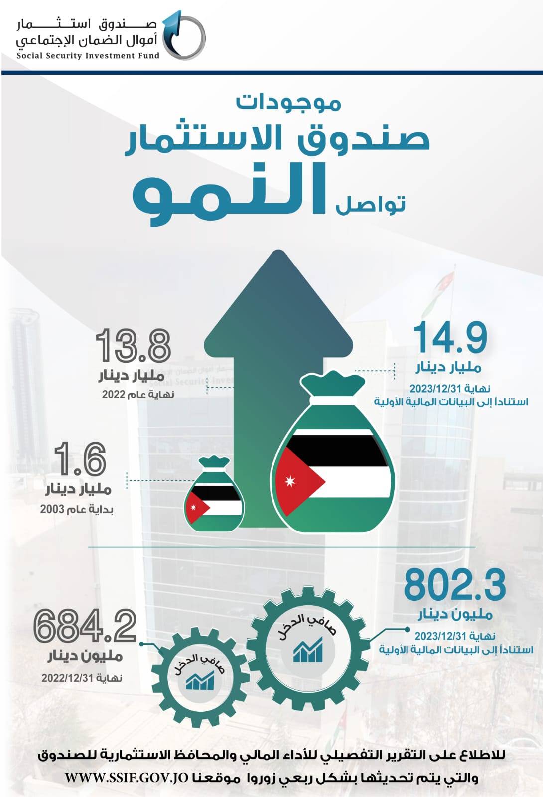وجاء النمو في حجم الموجودات والبالغ 1.1 مليار دينار من الدخل الشامل والبالغ 667 مليون دينار والذي يمثل دخل الصندوق من الأدوات الاستثمارية بقيمة 802 مليون دينار مطروحا منه انخفاض احتياطي تقييم الأسهم بقيمة 135 مليون دينار، بالإضافة الى الفائض التأميني المحول من المؤسسة العامة للضمان الاجتماعي والبالغ حوالي 380 مليون دينار.