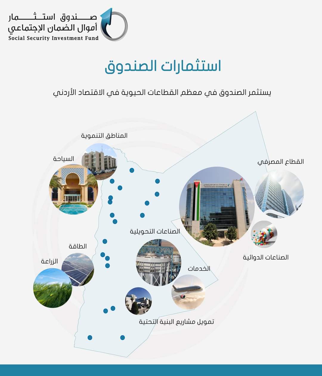 وبين أن قيمة محفظة الأسهم للشركات المساهمة العامة والخاصة قد بلغت حوالي 2.3 مليار دينار، منها حوالي 2.1 مليار دينار لاستثمارات في الشركات المدرجة في بورصة عمان، والتي تمثل حوالي 12.4% من إجمالي القيمة السوقية للبورصة، وتتوزع هذه الاستثمارات على كبرى الشركات في قطاعات البنوك والصناعة والخدمات. مشيراً بهذا الصدد الى ان حصة الصندوق من التوزيعات النقدية التي تم توزيعها خلال العام 2023 عن نتائج اعمال الشركات في عام 2022 قد بلغت 152 مليون دينار، وهي الأعلى في تاريخ الصندوق.