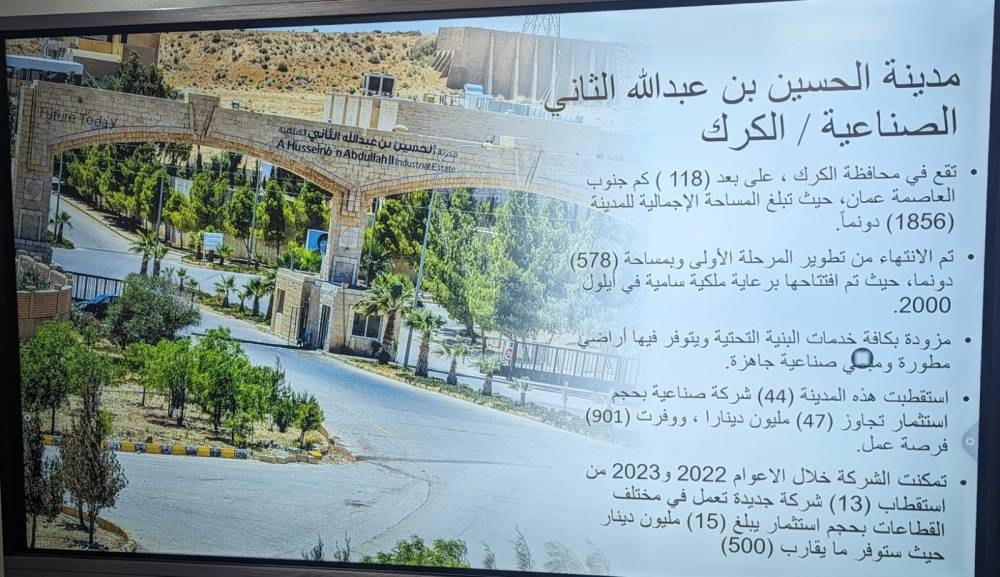 الى ذلك طالب رئيس مجلس محافظة الكرك الدكتور عبدالله العبادله باستقطاب المزيد من المشاريع الاستثمارية وتعزيز الحوافز للمدينة وخلق المزيد من فرص العمل. مشيدا بجهود شركة المدن الصناعية الاردنية وإدارة مدينة الحسين الصناعية في الترويج للمدينة وجعلها في مقدمة خيارات المستثمرين الصناعيين.