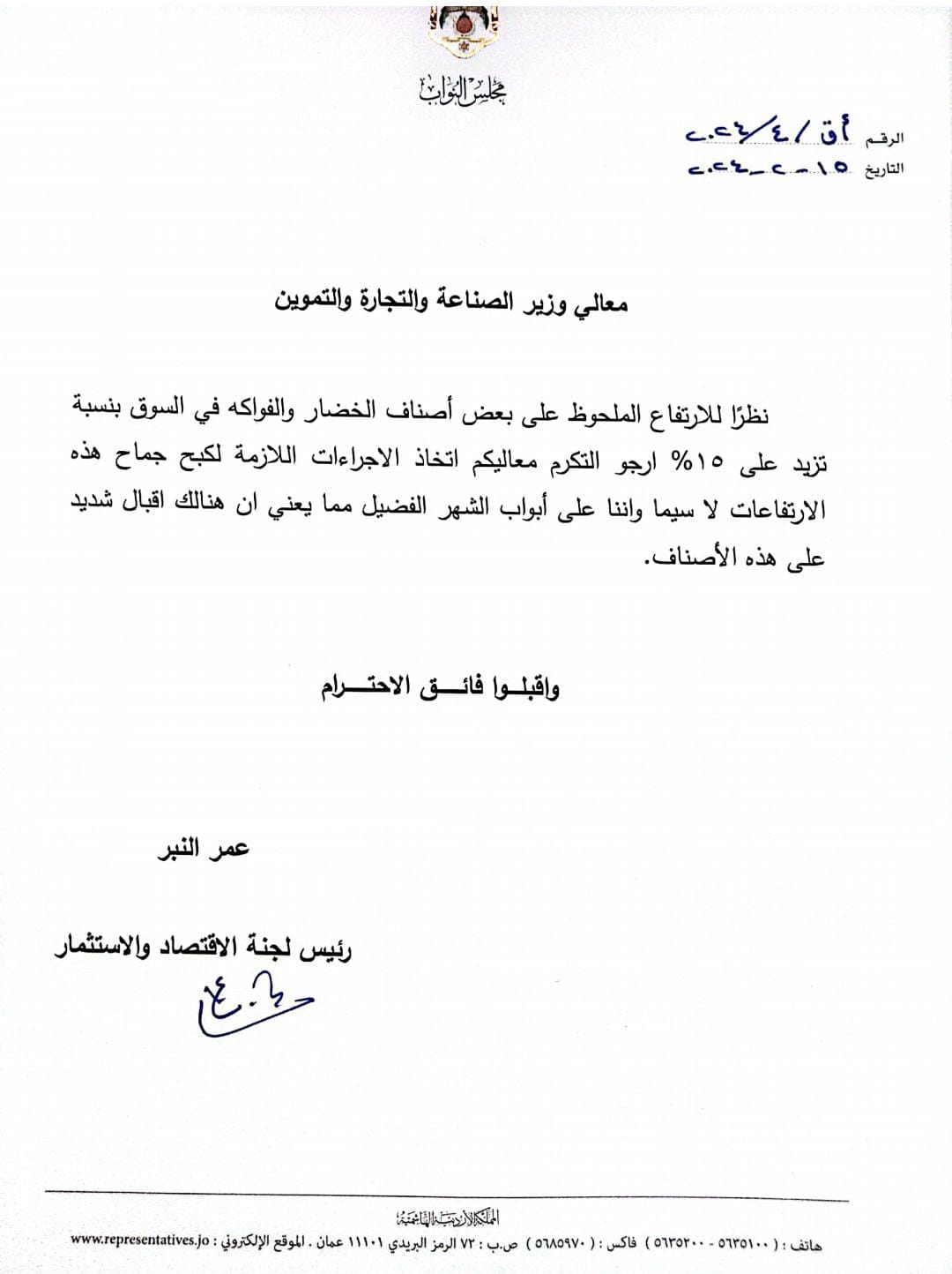 وجه رئيس لجنة الاقتصاد والاستثمار النيابية عمر النبر كتاب إلى وزير الصناعة والتجارة والتموين، مضمونه اتخاذ الإجراءات اللازمة وكبح جماح الارتفاع الملحوظ على بعض أصناف الخضار والفواكه في السوق.