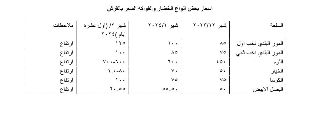 وأرفق النبر، أسعار بعض أنواع الخضار والفواكه المرتفعة، منها الثوم والخيار والكوسا والبصل الأبيض، والموز البلدي.