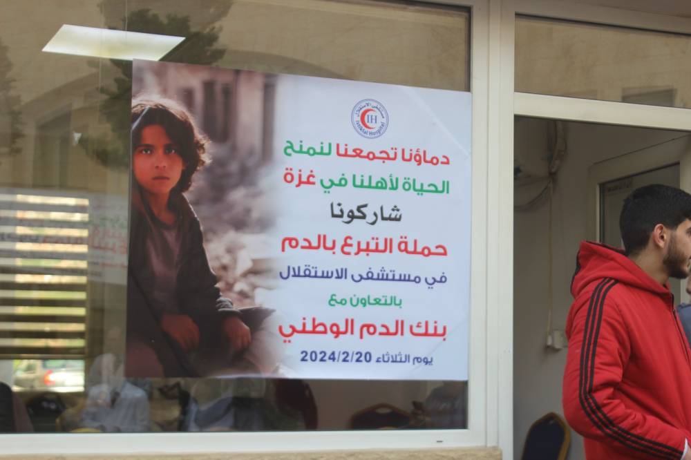 انطلاقاً من الواجب الإنساني والطبي والتشاركي مع قطاع غزة، أقام مستشفى الاستقلال أمس الثلاثاء الموافق 20-2-2024 حملة التبرع بالدم بالتعاون مع وزارة الصحة الأردنية وبنك الدم الوطني.