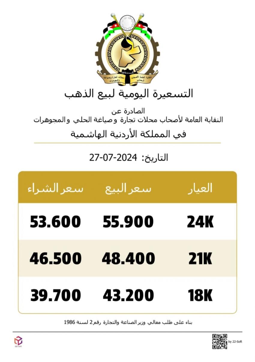 فيما بلغ سعر بيع الغرام الواحد من الذهب عياري 24 و18 لغايات الشراء من محلات الصاغة، عند 55.90 دينارا و43.20 دينارا على التوالي.