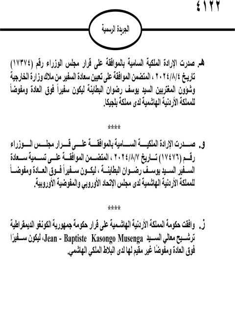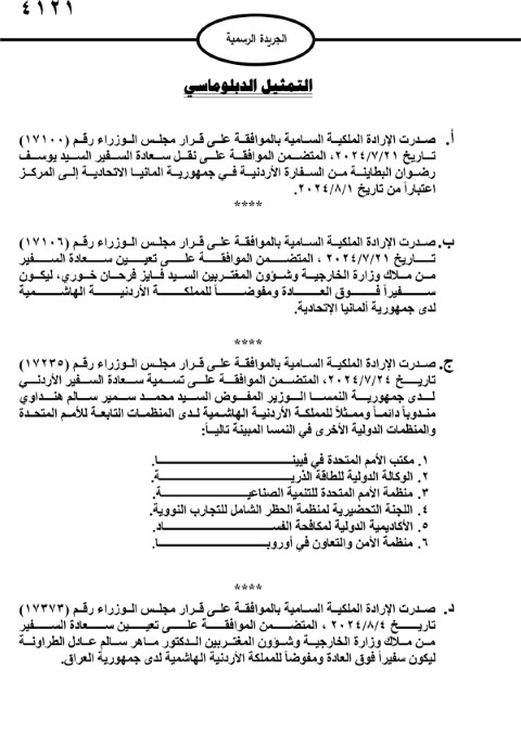 وتضمنت الإرادات الملكية بالموافقة على نقل السفير يوسف البطاينة من السفارة الاردنية في جمهورية ألمانيا الاتحادية إلى المركز اعتبارًا من 1 آب، وتعيينه سفيرًا لدى مملكة بلجيكا اعتبارًا من 4 آب بالإضافة إلى أن يكون سفيرًا فوق العادة ومفوضًا للمملكة لدى مجلس الاتحاد الأوروبي والمفوضية الأوروبية.