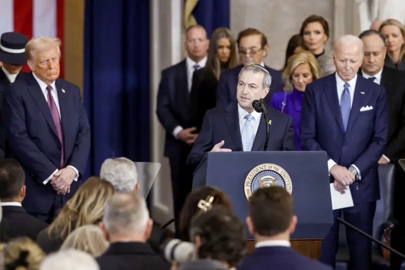 وأشاد بيرمان، الذي ارتدى قبعة يهودية وشريطاً أصفراً لإظهار دعمه للرهائن، بترامب في مساعدته على التوصل إلى اتفاق لوقف إطلاق النار في غزة.
