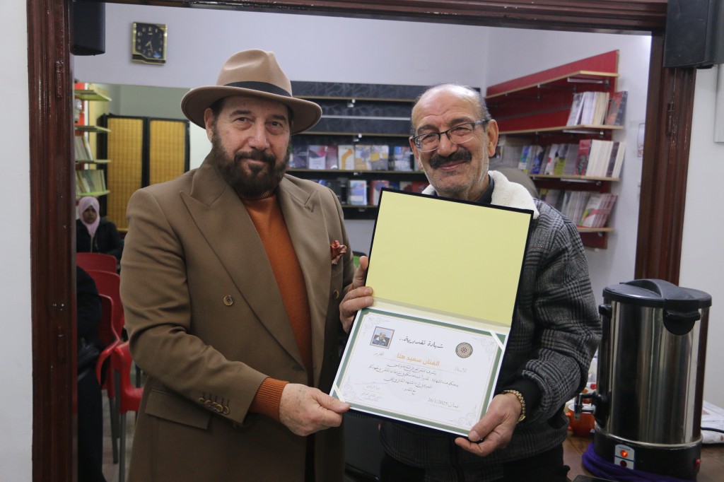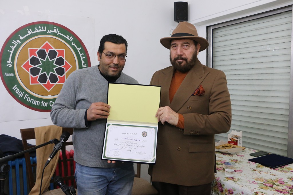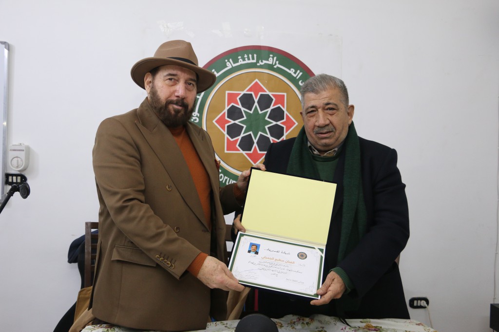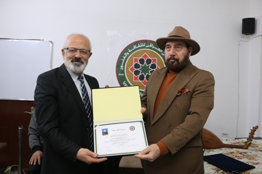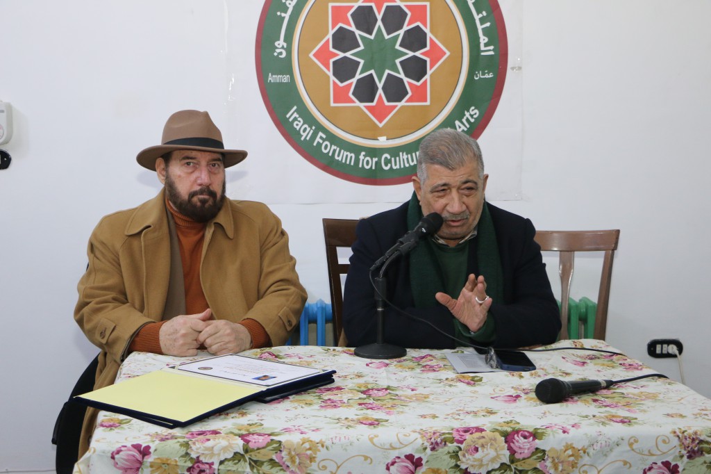 اقام الملتقى العراقي للثقافة والفنون أمسية ثقافية فنية مزدوجة تنوعت بين الفن التشكيلي والموسيقى استضاف خلالها الفنان التشكيلي مطيع الجميلي للحديث حول معرضه التشكيلي والذي أقيم مؤخراً في مقر مجلس الاعمال العراقي بعمان تحت عنوان (جدران واطباق) والطبيب الفنان الدكتور نسيم الدقم والذي يزور حالياً مدينة عمان قادماً من فرنسا بمشاركة الفنان سعيد مهنا ومشاركة خاصة من الفنان الاردني علاء شاهر في قاعة بيت الثقافة والفنون بعمان مساء اليوم الاحد 26/كانون ثاني/2025 م وقد ادار الأمسية رئيس الملتقى الصحفي والباحث الفنان ضياء الراوي بحضور عدد من أعضاء الملتقى بالإضافة الى عدد من الكتاب والادباء والفنانين والإعلاميين والمهتمين وفي ختام الأمسية قام الراوي بتكريم الفنانين المشاركين في الامسية .