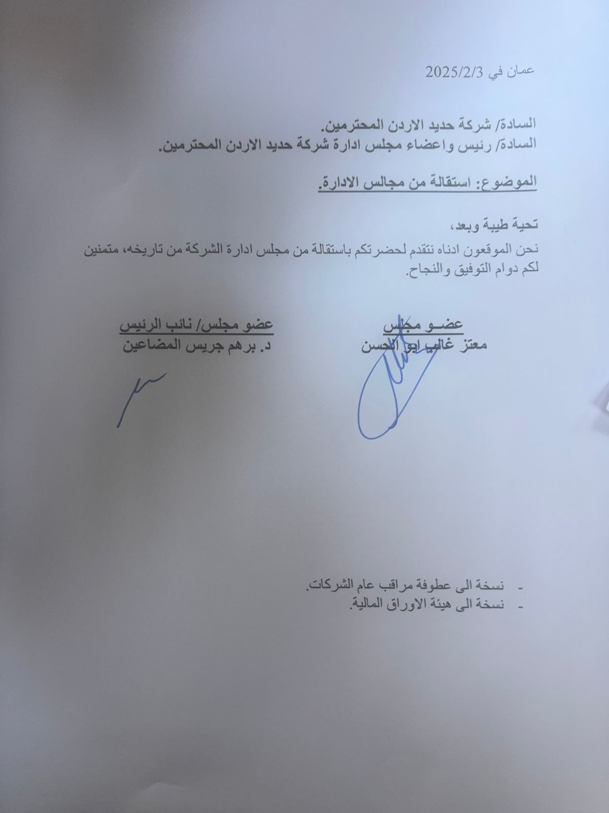 تداولت وسائل الإعلام، اليوم الاثنين، أنباءً تفيد بتقديم عضوين من مجلس إدارة شركة حديد الأردن استقالتهما بشكل مفاجئ، مما يثير تساؤلات جوهرية حول شرعية المجلس الحالي وقدرته على الاستمرار في ممارسة مهامه واتخاذ القرارات القانونية،فغياب النصاب القانوني المطلوب لاستمرارية المجلس قد يفتح الباب للطعن في قانونية قراراته وإجراءاته.