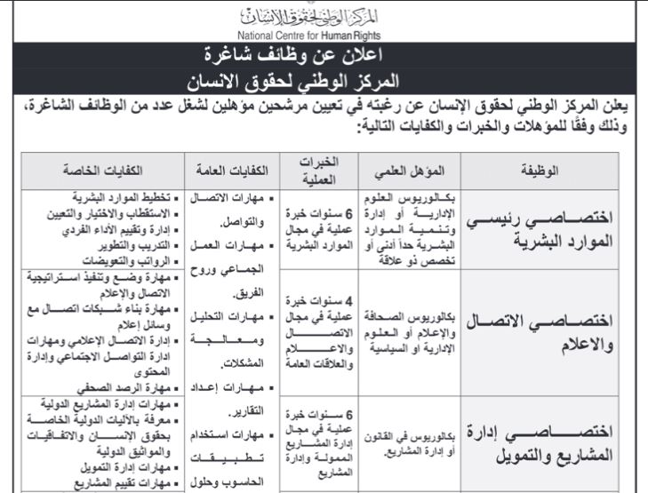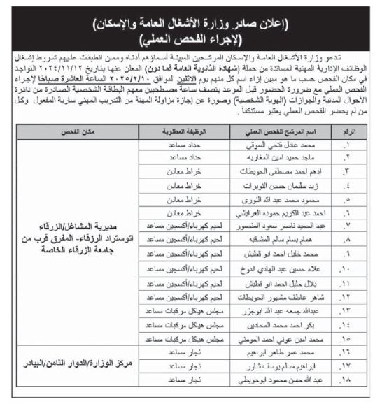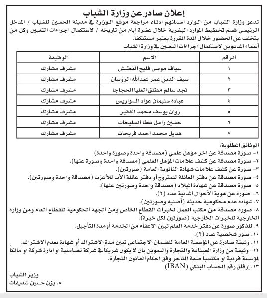 أعلنت عدداً من الوزارات والمؤسسات الرسمية، اليوم الخميس، عن حاجتهم لتعبئة وظائف شاغرة، فيما دعت عدد من المرشحين لاسكتمال اجراءات التعيين.