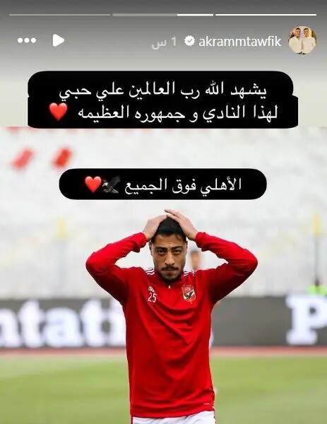 وبعد هذا الجدل نشر اللاعب رسالة عبر خاصية ستوري بموقع "إنستغرام" قائلا:" يشهد الله رب العالمين على حبي لهذا النادي وجماهيره العظيمة الأهلي فوق الجميع".