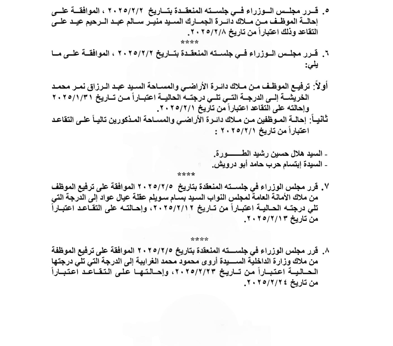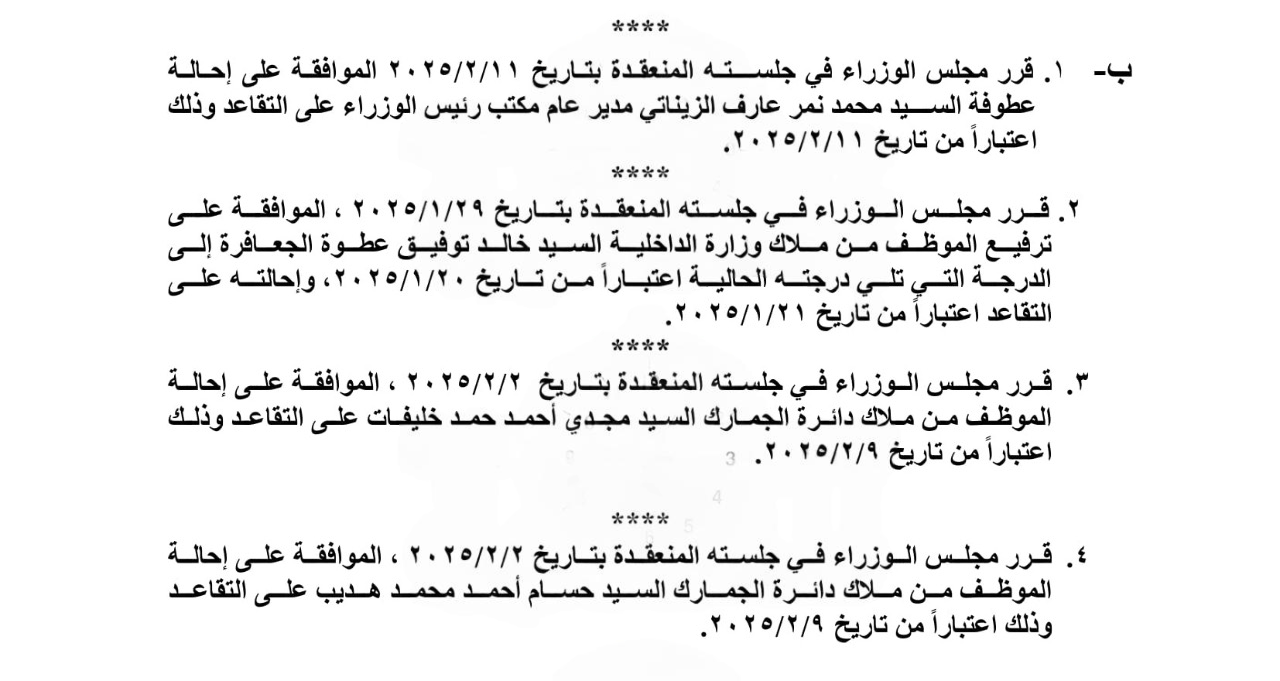 قرر مجلس الوزراء إحالة موظفين في عدد من الوزارات والدوائر إلى التقاعد.