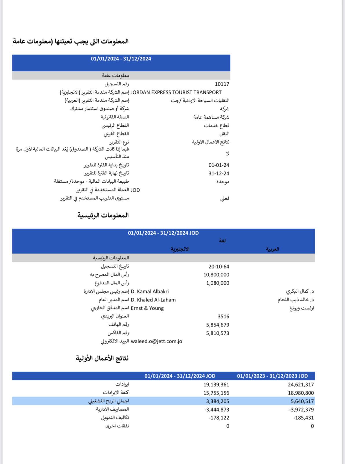 لا نعلم كيف سيتعامل رئيس ومجلس إدارة شركة النقليات السياحية الأردنية/ (جت) مع النتائج التي أفصحت عنها الشركة وأظهرت مؤشرات ربما تؤشر على وجود خلل كبير ضرب اساسيات الميزانية للشركة وجعلها أمام تساؤلات تحتاج إلى مجلدات وشروحات لا تبريرات عن النتائج الأعمال الأولية التي لا يجوز أن نبقى نعلقها على الظروف الجيوسياسية والحروب والأزمات بالرغم من أهمية ذلك وأهمية توفر مناخ سياحي ملائم للإستثمار في هذا القطاع الذي لا شك أنه يعاني أسوةً بالكثير من قطاع الخدمات العامة وقطاعات النقل وربما السياحة ولكن المشكلة هنا ليست بالنتائج فقط بل لبعض المؤشرات التي كانت سبباً في تكبّد الشركة خسائر مالية كبيرة وملفتة للإنتباه وصلت إلى حوالي ربع مليون دينار بعد دفع الضريبة وهي بالمناسبة تجاوزت النصف مليون دينار ولكن ليس هنا المشكلة فالمشكلة تكمن بأن شركة "جت" حققت إيرادات تجاوزت (19) مليون دينار وهذا رقم كبير ومع ذلك فقد تراجعت ايرادات الشركة (5) مليون دينار عن العام السابق ، هل يستطيع مجلس الإدارة أن يشرح لنا وللمساهمين أسباب تراجع إيرادات الشركة لأكثر من (5) مليون ونصف عن العام الماضي ؟ وهل يستطيع مجلس الإدارة أن يفسر لنا عن سبب إرتفاع كلفة الايرادات التي وصلت إلى (15.7) مليون دينار وهي تكلفة مرتفعة لا تتناسب مطلقاً مع الايرادات ؟ وهل يعقل أن تبلغ المصاريف الادارية (3.4) مليون دينار وهذا رقم مفزع ومقلق ومرعب إذا ما تم مقارنته مع العام الماضي حيث وصلت المصاريف إلى (3.9) مليون دينار؟ وقد يتسائل أحدهم معللاً أن النفقات الإدارية لهذا العام أقل من العام الماضي ولكن لا تؤخذ الأمور والحسابات بهذه النظرة لأن الايرادات في العام الماضي كانت تتجاوز الـ (24) مليون دينار هذا إذا تم إضافة تكاليف التمويل والقروض والتسهيلات الممنوحة للشركة والتي كلفت هذا العام كفوائد (178) ألف دينار.