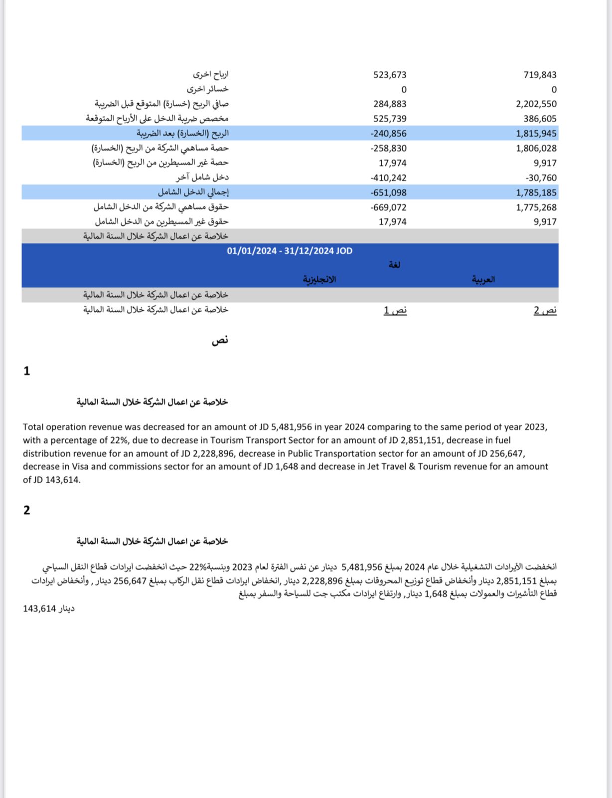 المؤشرات تقول أن الايرادات التشغيلية انخفضت عن العام الماضي بمقدار (5.4) مليون وبنسبة (22%) وحتى نكون دقيقين فقد توزع هذا المبلغ على ايرادات النقل السياحي وقطاع توزيع المحروقات وايرادات قطاع نقل الركاب وقطاع التأشيرات والعمولات ومكاتب السياحة والسفر مما يتطلب من مجلس الادارة والمدير العام أن يشرحوا للمساهمين حقيقة خسائر الشركة والتي يبدو أنها لن تتوقف عن هذا الحد آملين من مجلس الادارة وضع يده وبشكل دقيق وعلمي بتشخيص واقع وحال الشركة من جديد للوصول إلى حلول مقنعة تعيد الشركة على ما كانت عليه في السابق عندما كانت تحقق أرباحاً بالملايين .