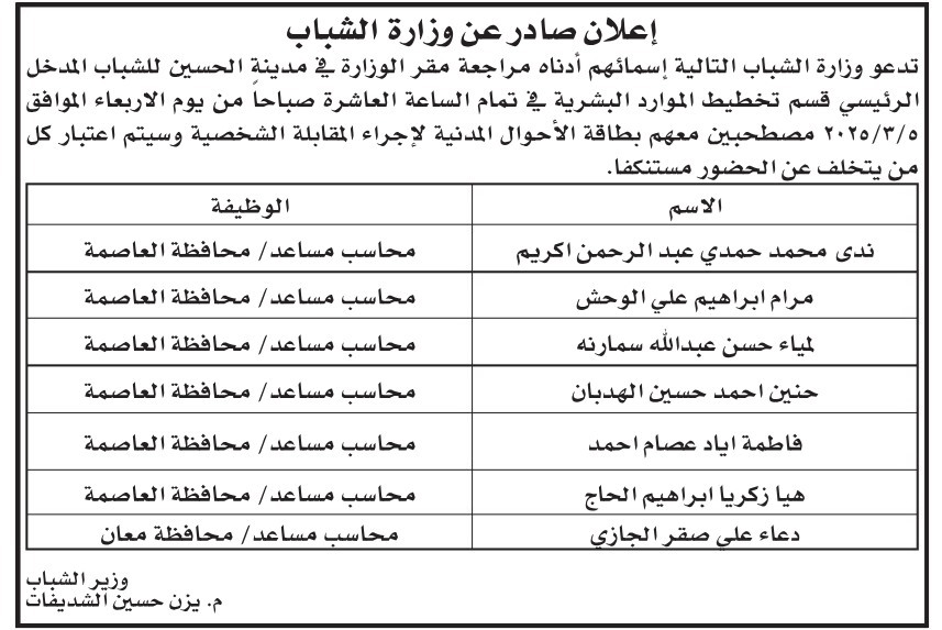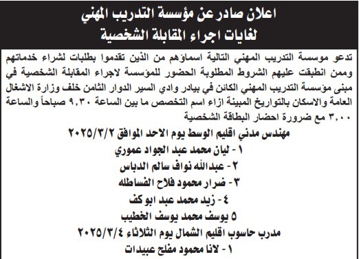 دعت دوائر حكومية التالية اسماؤهم لاجراء المقابلات الشخصية لغايات التعيين .