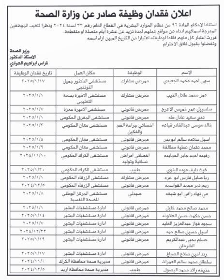 أعلنت وزارة الصحة، اليوم الأحد، عن فقدان موظفين لوظائفهم، وذلك نظرا لتغيبهم عن مواقع عملهم لمدة تزيد عن 10 أيام متصلة أو متقطعة.