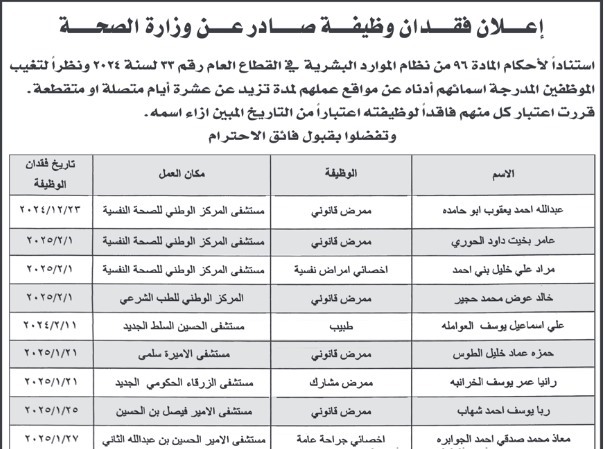 أعلنت وزارة الصحة، اليوم الأحد، عن فقدان موظفين لوظائفهم، وذلك نظرا لتغيبهم عن مواقع عملهم لمدة تزيد عن 10 أيام متصلة أو متقطعة.