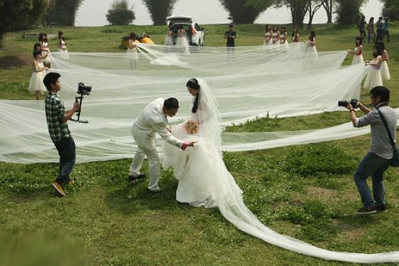 أدهشت فتاة صينية الحضور في حفل زفافها، بعد أن خرجت عليهم في عرسها بثوب طوله 520 مترا ووزنه 50 كيلوجراما. وقامت العروس 'لي كيو' البالغة من العمر 25 عاما، بعرض ثوبها وسط إحدى حدائق العاصمة الصينية 'بكين'، حيث اصطف نحو 20 فتاة في صفين لحمل الثوب، بحسب صحيفة 'ديلي ميل' البريطانية.