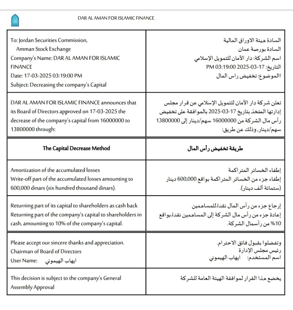شكاوى عدة ومتعددة وصلت "أخبار البلد" بعد قيامنا بنشر تقرير حول قيام وليد مسعود وهو بالمناسبة شخص مطلع وشقيق لرئيس مجلس الإدارة سعيد المسعود الذي يقيم في الإمارات بشراء 28 ألف سهم في شركة دار الأمان التي ينتظرها قرارات هامة مثل تخفيض رأسمال الشركة من 16 مليون دينار إلى 13.8 مليون دينار عن طريق إطفاء جزء من الخسائر المتراكمة بواقع 600 ألف دينار وإعادة وإرجاع جزء من رأسمال الشركة نقداً إلى المساهمين بواقع 10% من رأسمال الشركة ... بالطبع هذا ليس تحليل بل معلومة تم نشرها من قبل الشركة على موقع بورصة عمان وصادر بتاريخ 17/3/2025 ويبدو أن هذا الإفصاح ينطبق عليه مثل الذي يقول "إذا عرف السبب بطل العجب" ونقصد هنا عجب الشراء المبرمج والمخطط له من قبل أعضاء أو كبار مساهمين أو مطلعين على القرارات الصادرة عن مجلس الإدارة صاحب الفكرة والمسيطر والمهيمن على قرارها والذي يملك الأغلبية في ذلك .
