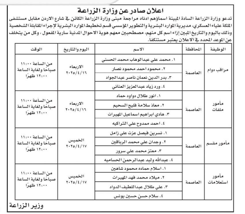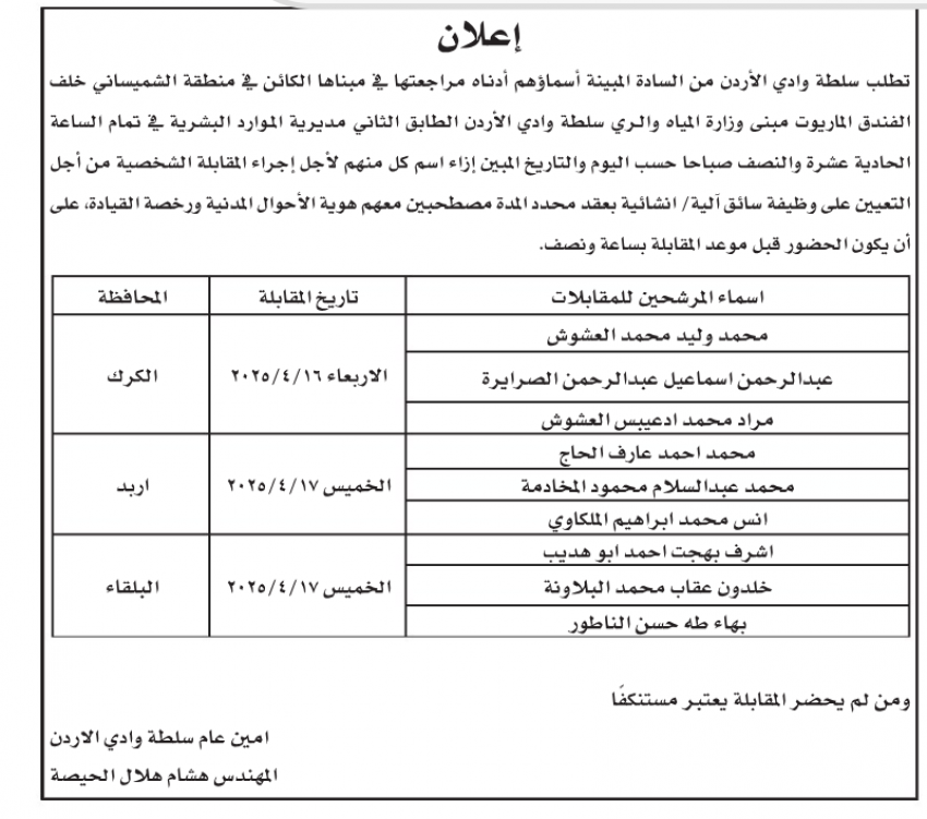 دعت وزارة الزراعة وسلطة وادي الأردن مرشحين لإجراء المقابلات الشخصية لغايات التعيين.