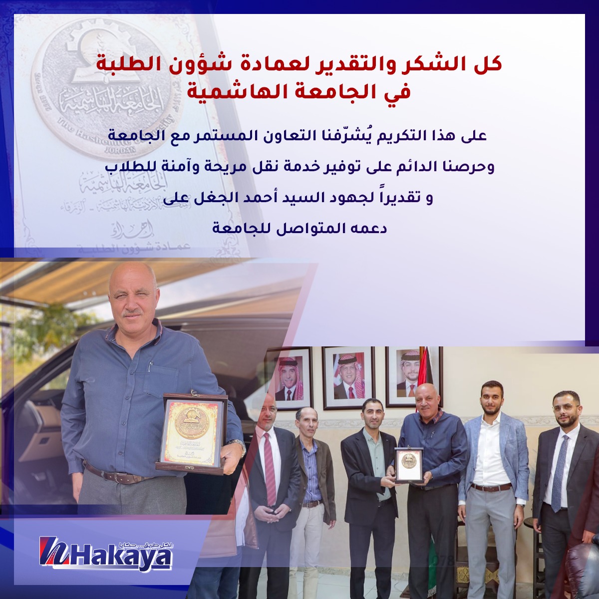 فقد انعم جلالة الملك عبدالله الثاني على السيد احمد الجغل بوسام اليوبيل الفضي وذلك لمساهمته وجهوده في رفع مستوى خدمات النقل العام وخصوصا النقل الجامعي من خلال شركتي نقليات احمد الجغل وشركة طريق الحكايا، وبهذا التكريم فإننا نعلق على جبين وصدر إدارة الشركة خرزة زرقاء من الحسد على ما وصلته من اختراق الصفوف الأولى واخذها مقعدا مميزا بيضت وجه قطاع النقل فيه.