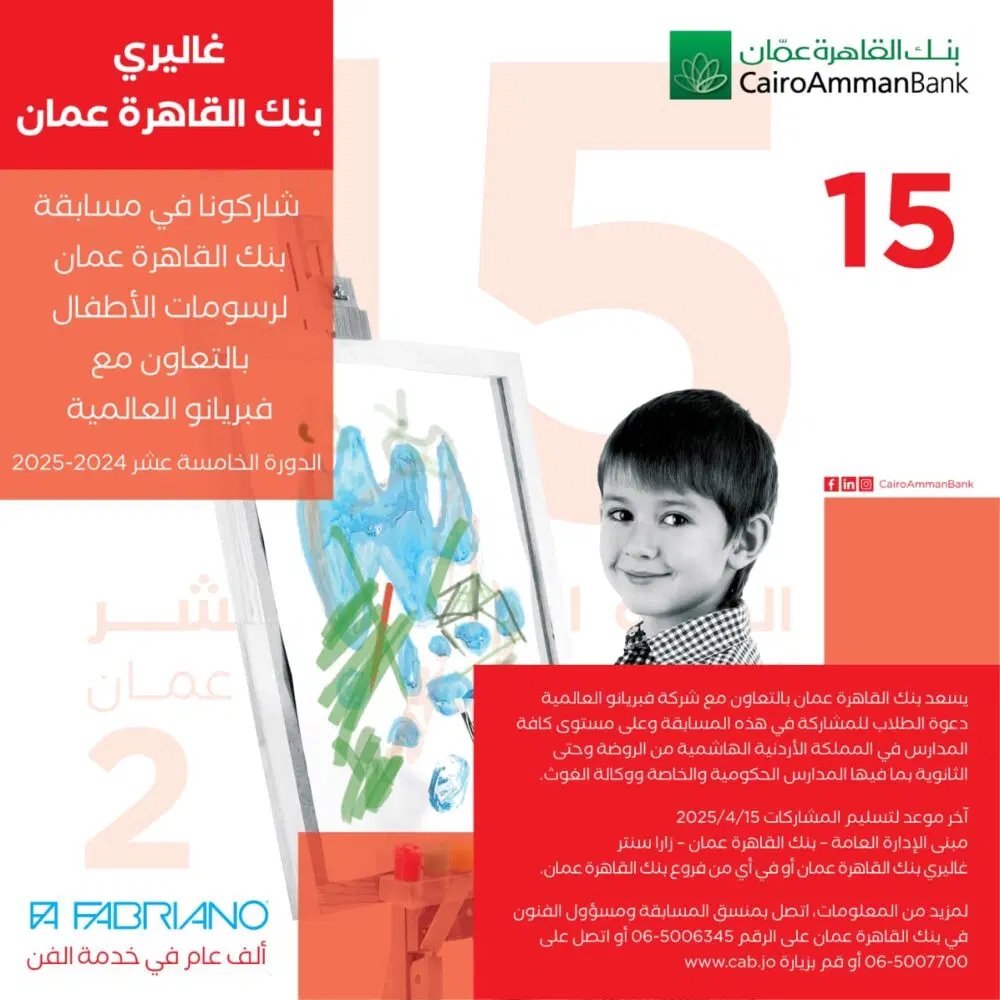 اعلن جاليري بنك القاهرة عمان عن اسماء الفائزين بمسابقة رسومات الاطفال لدورته الخامسة عشر للعام 2025 والتي ينظمها البنك سنويا لاطفال وطلاب الاردن لمختلف الفئات.